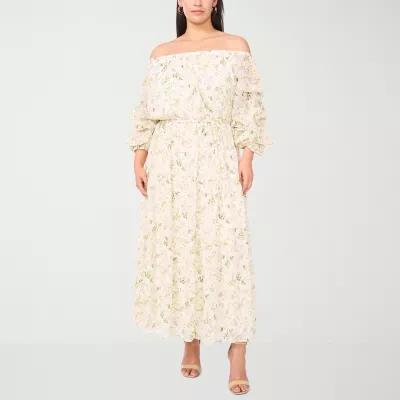 Sam And Jess Womens Off The Shoulder 3/4 Sleeve Floral Fit + Flare Dress Plus