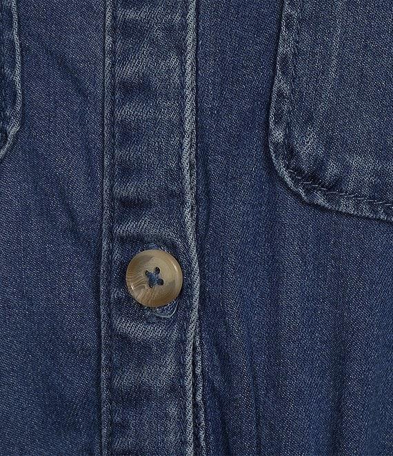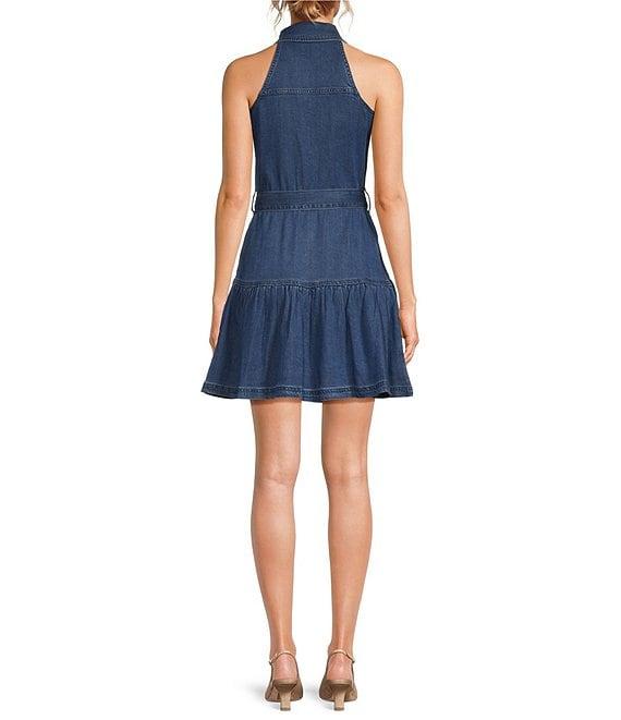 From Sam Edelman, this dress features: Denim fabrication Shirtdress silhouette Halter neckline with collar Sleeveless Two chest flap functional button pockets Side belt loops Self waist belt Tiered skirt Button front closure Approx. 34" length Machine wash Imported.