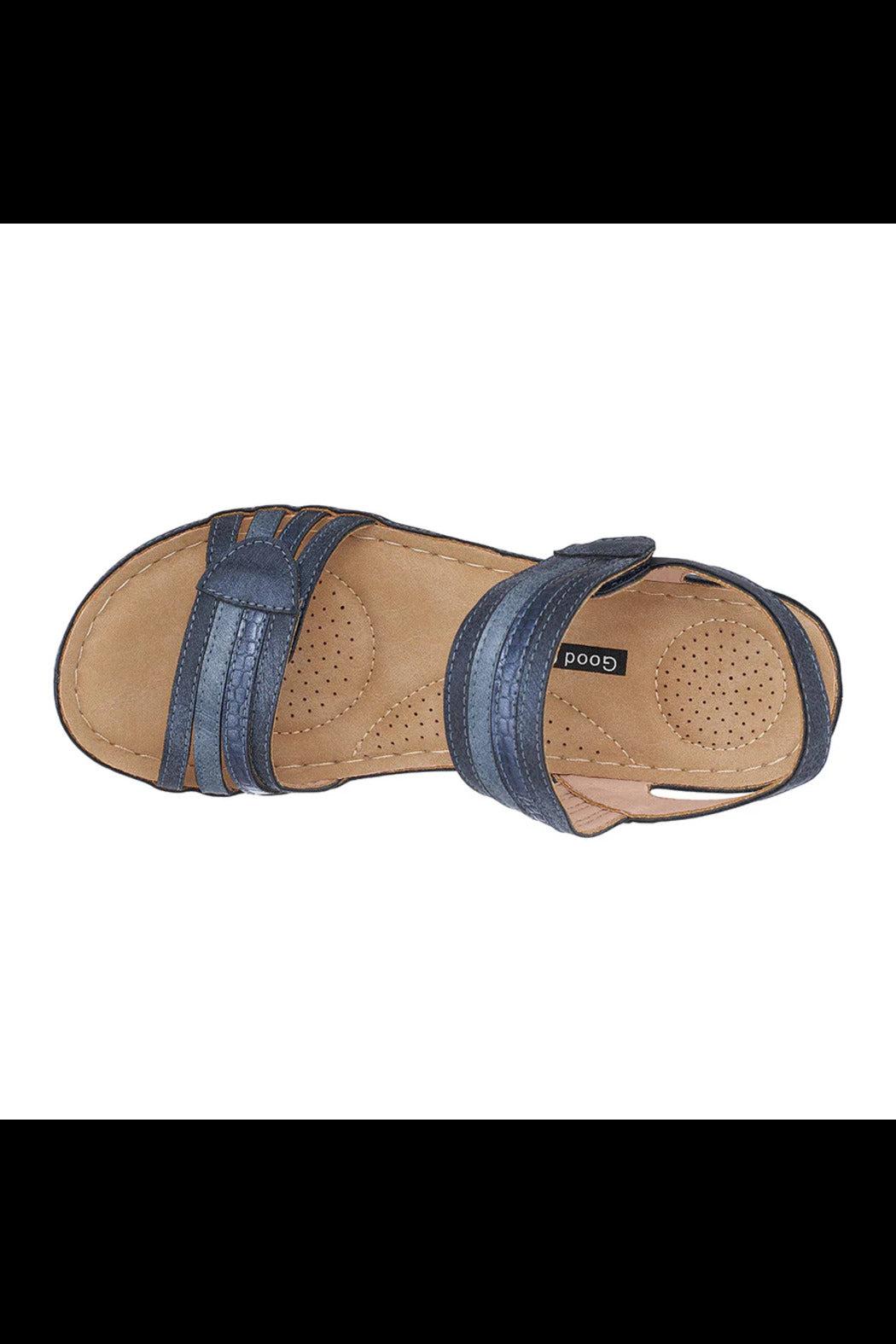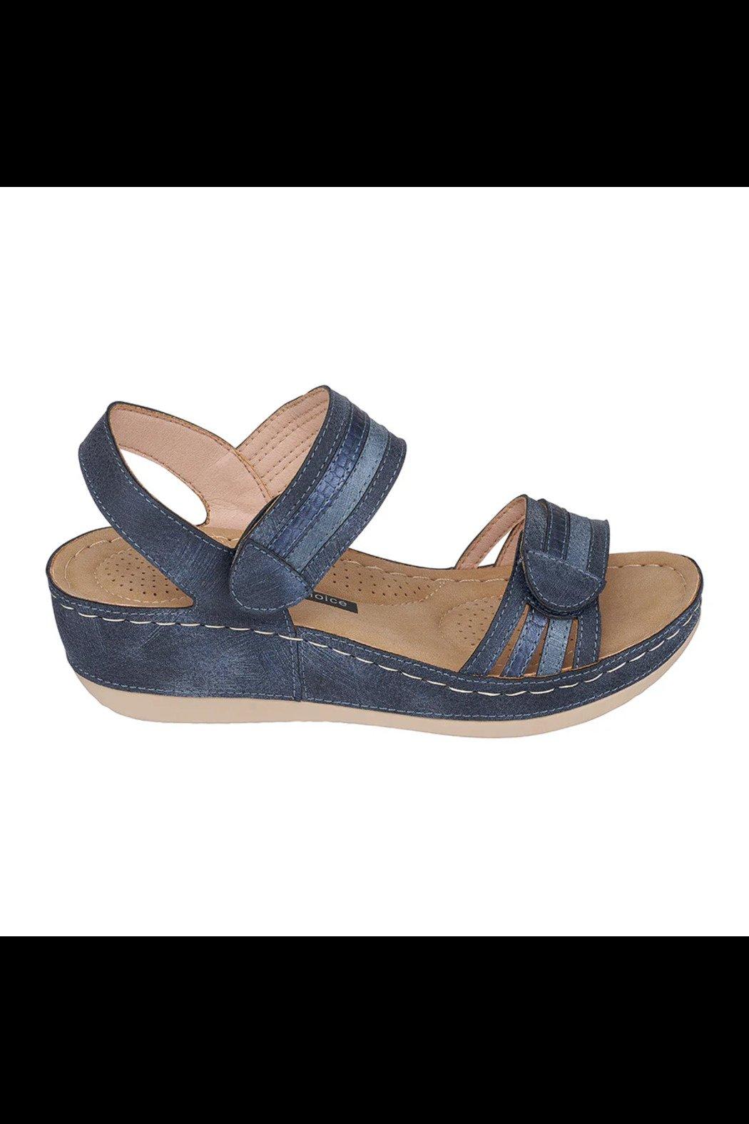 This is a gorgeous navy wedge sandal that has velcro on both straps to make it easy to adjust to fit your foot properly. It has a 2" wedge with a 1" platform so it is very easy to walk in. It has different tones of blues in the shoe that can easily be paired with anything from a casual outfit all the way to a fancy occasion.