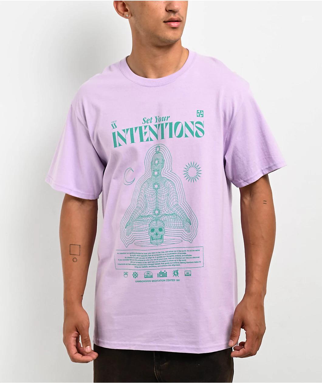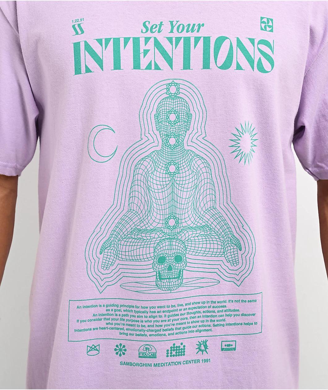 Become mindful of keeping your chakras aligned with the Set Your Intentions t-shirt from Samborghini in a light purple colorway adorned with teal green accents. The screen-printed graphic on the front depicts a rippling aura of a human figure, displa
