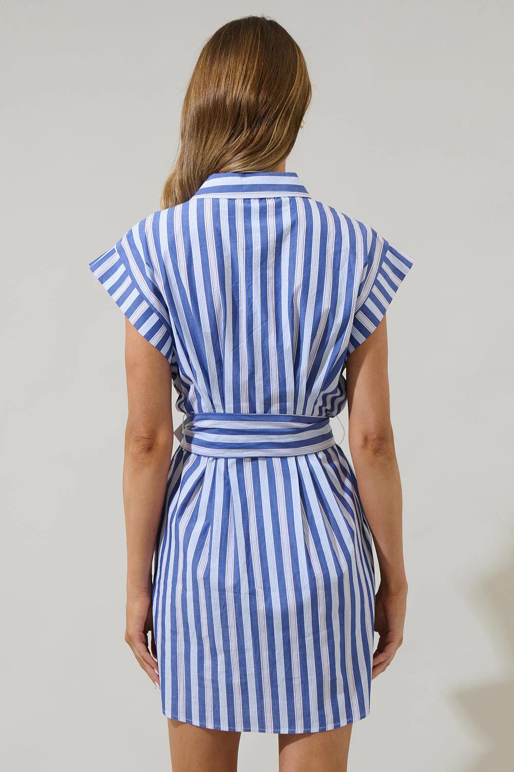 This lovely striped pattern designs a dropped shoulder style with short sleeves and a collared neck. The front has a button up placket with a belt around the waist can be adjusted. Wear some espadrilles to complete your look.