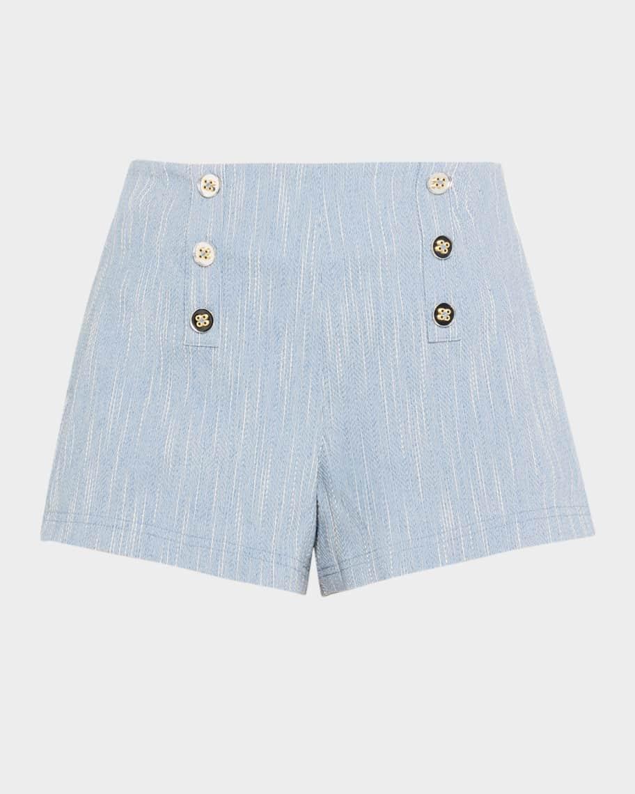 Ramy Brook "Samira" shorts with metallic striping and front statement buttons Approx. 3" inseam High rise Relaxed legs Side seam zipper Cotton/polyester/nylon/polyamide Lining: Polyester/spandex Dry clean Imported
