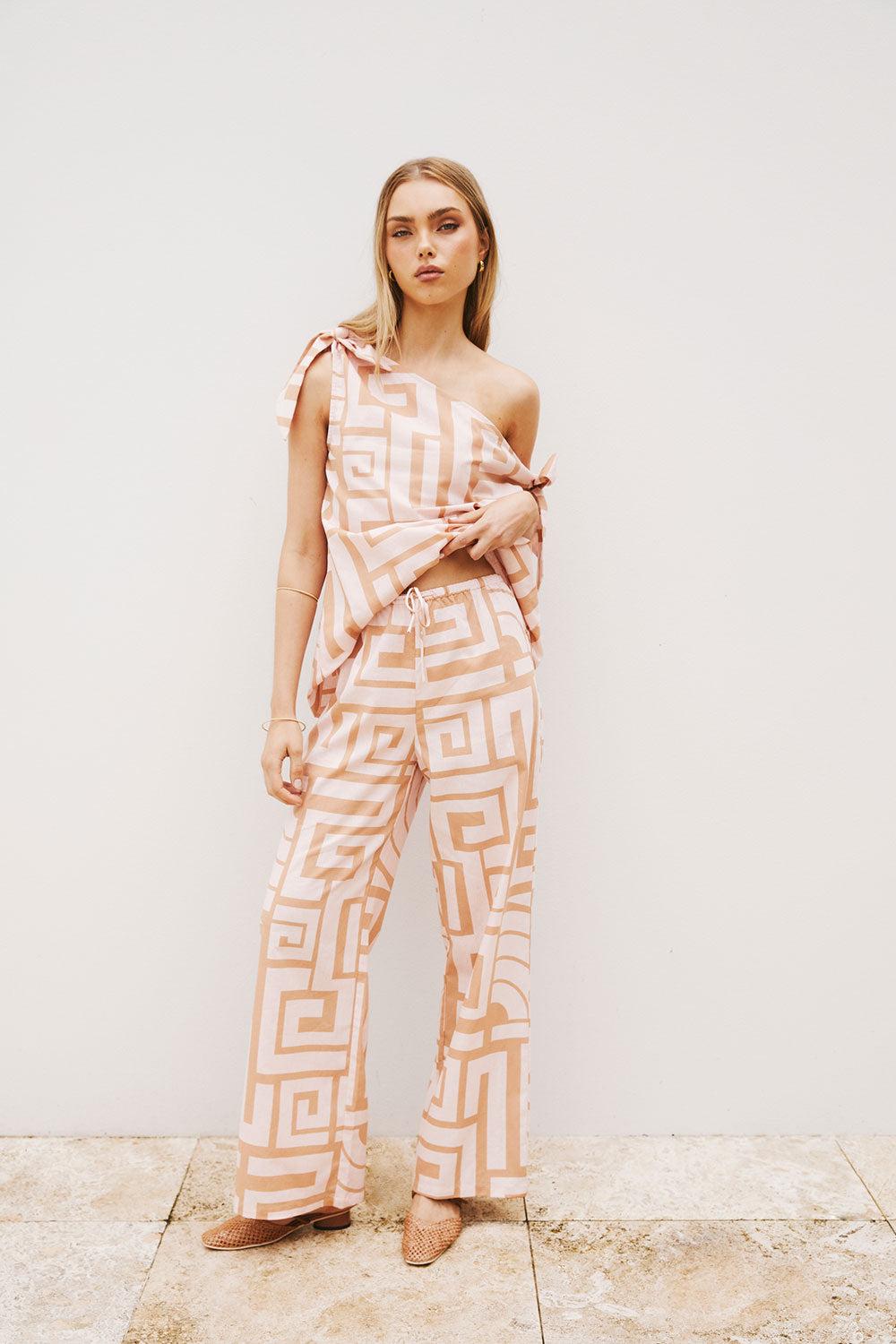 A resort inspired design with our exclusive new Hellenic Maze print! The Kahli Top is made from a structured natural linen cotton blend fabric and features a boxy fit, asymmetric neckline, wide tie closure at shoulder and armhole and longline hem. Get the set with the Kahli Pants! Designed exclusively by Sabo.