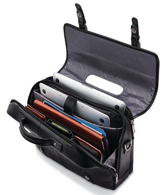 From Samsonite, this briefcase features: Leather Magnet snaps for quick access to main body pockets Large front accessory slip pocket with 2 phone pockets, pen pockets and zip pocket Main compartment features curve zip opening for maximum access, fully padded laptop pocket (fits up to 15.6" laptop), 3 gusseted accessory pockets Large back zip pocket Adjustable, detachable strap with non-slip shoulder pad Smart sleeve for ease of use while traveling Approx. 16.25" L x 4.25" W x 12.5" H, weight 3.9 lbs Imported.
