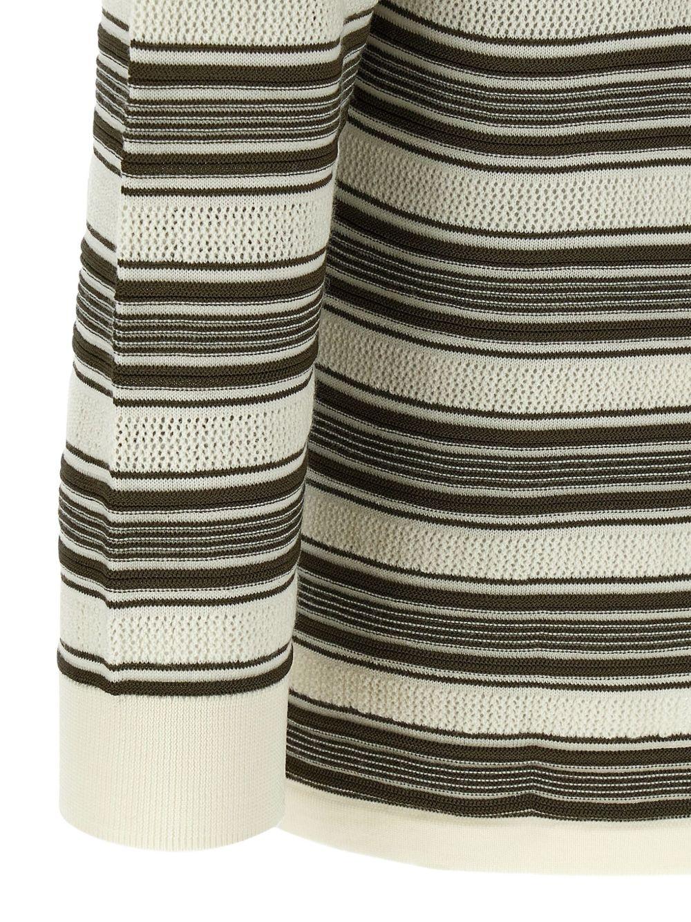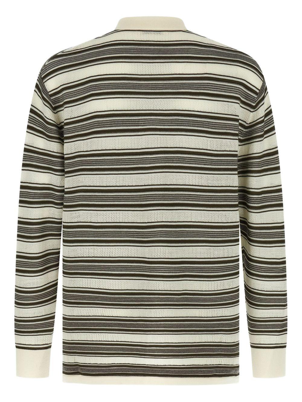 Wales Bonner Samuel striped polo shirt | Neutrals | off-white and brown | horizontal striped pattern | perforated inserts | long cuffed sleeves | short button fastening | asymmetric hem | Wool/Viscose/Polyamide | Polo Shirts | Clothing | Men