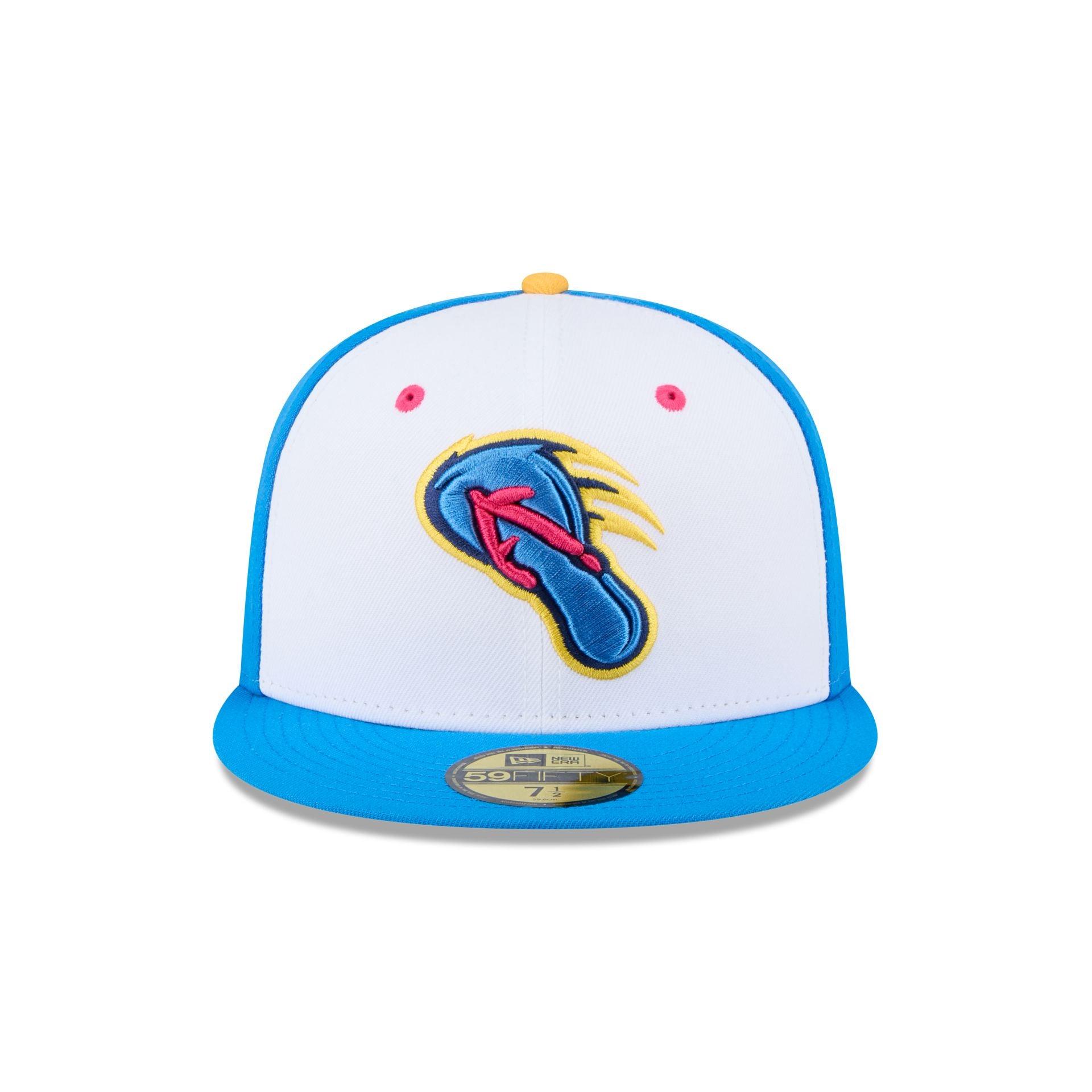 The San Antonio Missions Copa de la Diversión 59FIFTY Fitted Cap features an embroidered Flying Chanclas logo at the front panels with a matching MiLB Batterman logo at the rear.