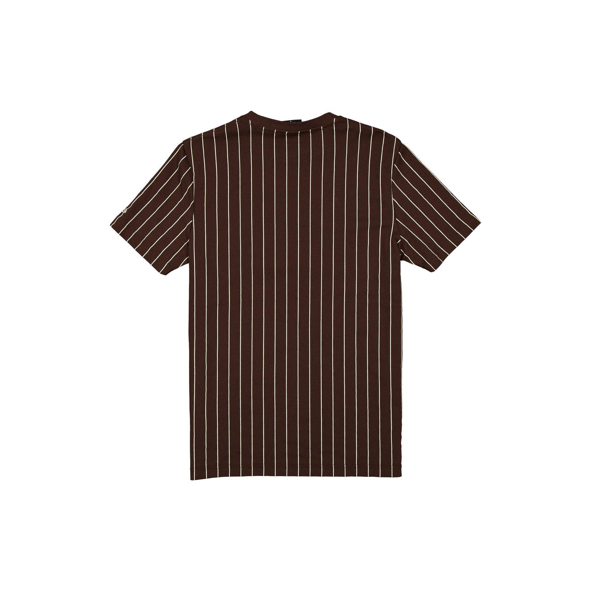 The San Diego Padres Throwback Pinstripe Wordmark T-Shirt features a twill applique Padres wordmark and logo at the front with a New Era jock tag at the left hip.Fabric: 63% Cotton, 37% Polyester