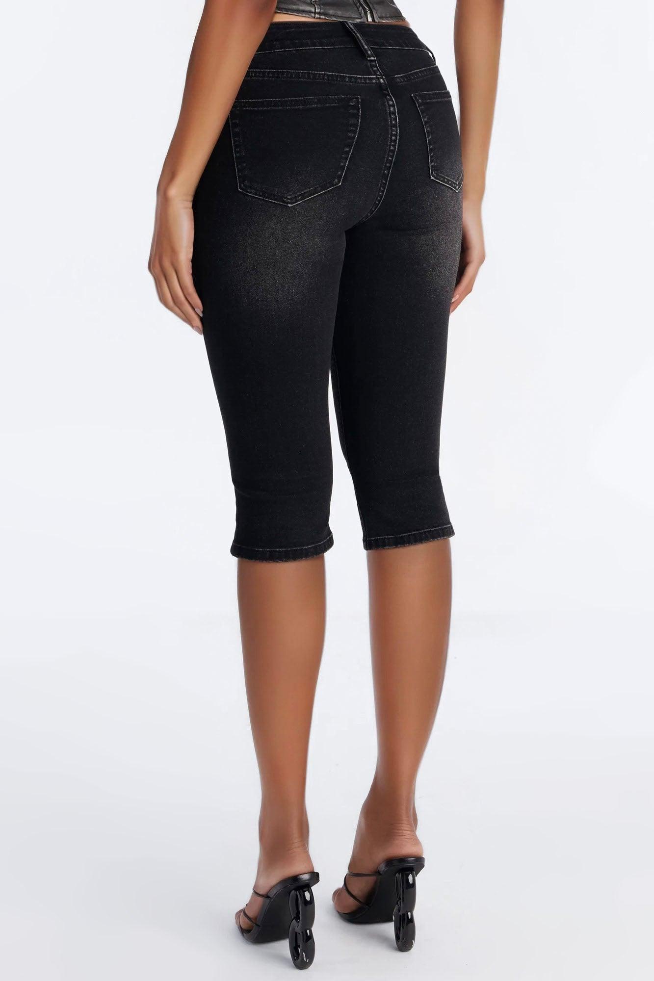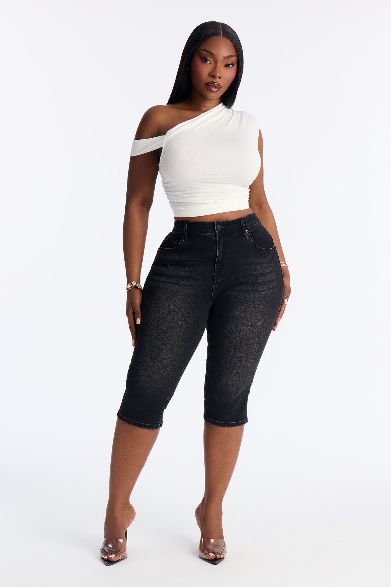 Available In Black, Dark Wash And Light Wash. Capri Jean 5 Pocket Dart Shaping Detail 11" High Rise 17" Inseam Medium Stretch Disclaimer: Due To The Specialized Wash Process, Each Garment Is Unique. 54% Cotton 26% Polyester 18% Rayon 2% Spandex Imported California Proposition 65WARNING: Cancer and Reproductive Harm - www.P65Warnings.ca.gov.