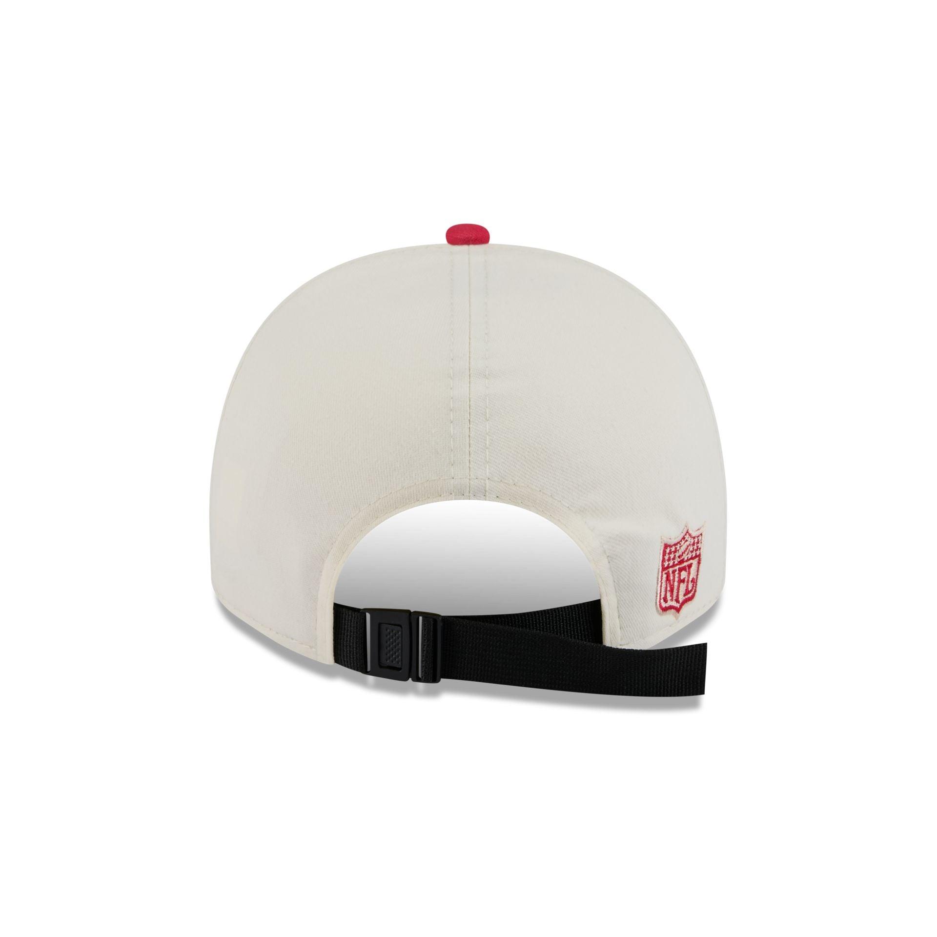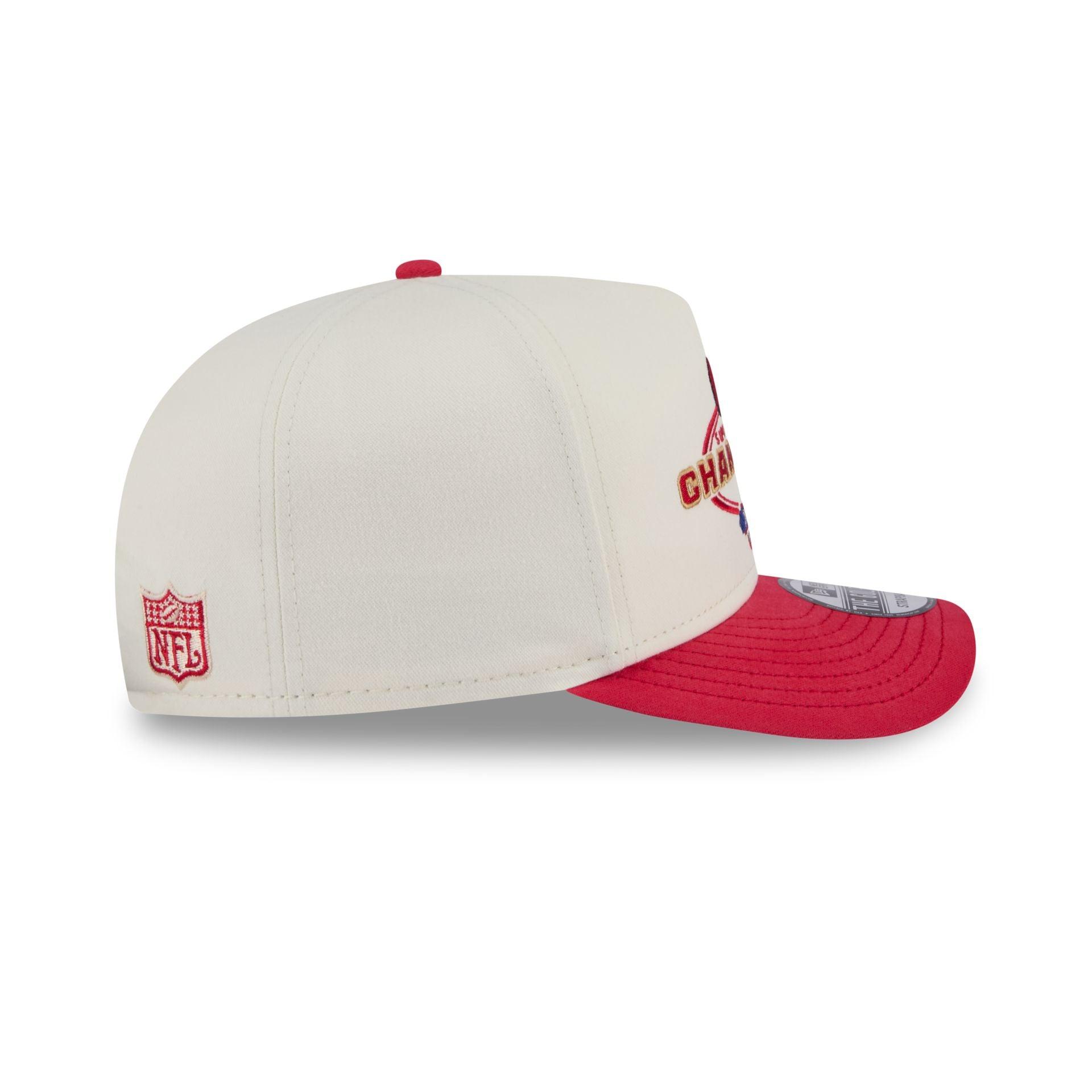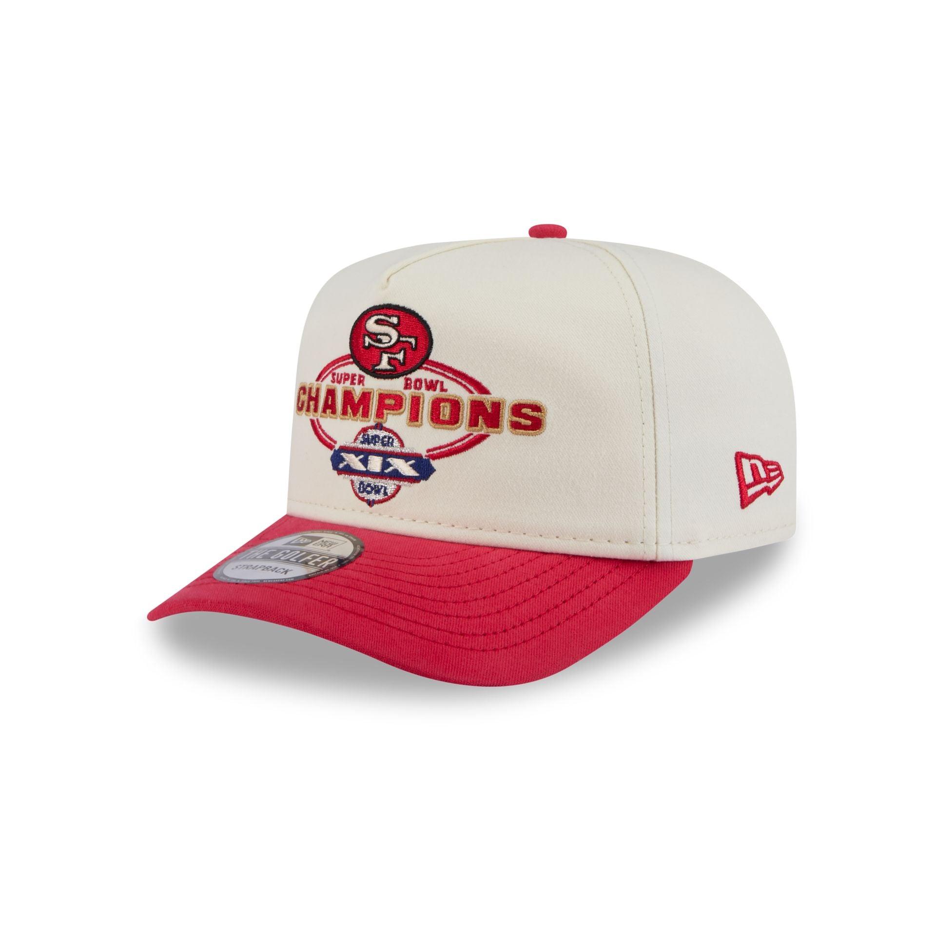 The San Francisco 49ers Chrome White Champions Golfer features an embroidered Super Bowl Champions wordmark and Historic team logo at the front panels. Additional details include an NFL Shield logo at the right-rear, a strapback closure, and a green undervisor
