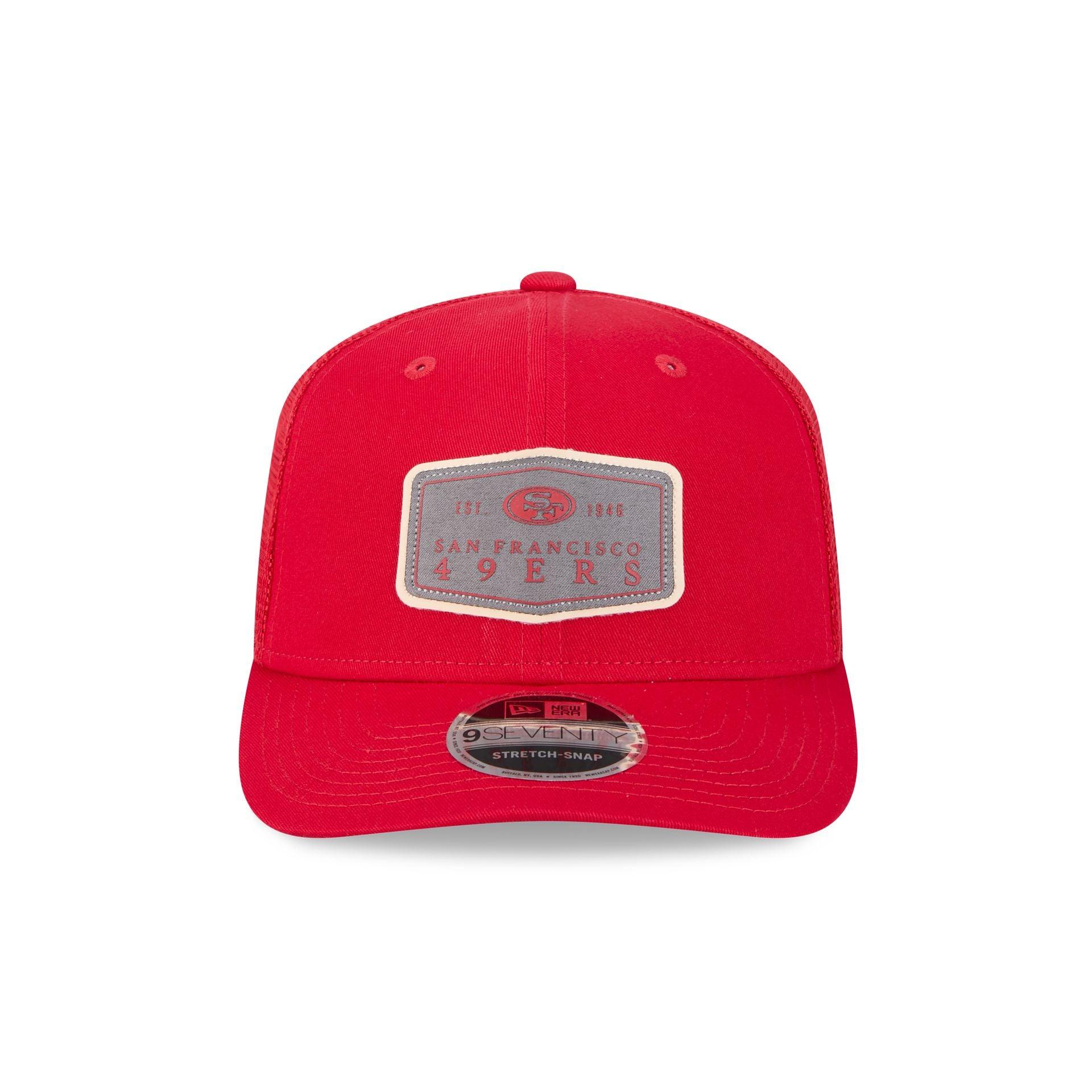 The San Francisco 49ers Labeled 9SEVENTY Stretch-Snap Cap features an embroidered 49ers Inaugural Year patch at the front panels with a matching New Era Flag at the left-wear side. Additional details include a gray undervisor and a snapback closure at the rear.
