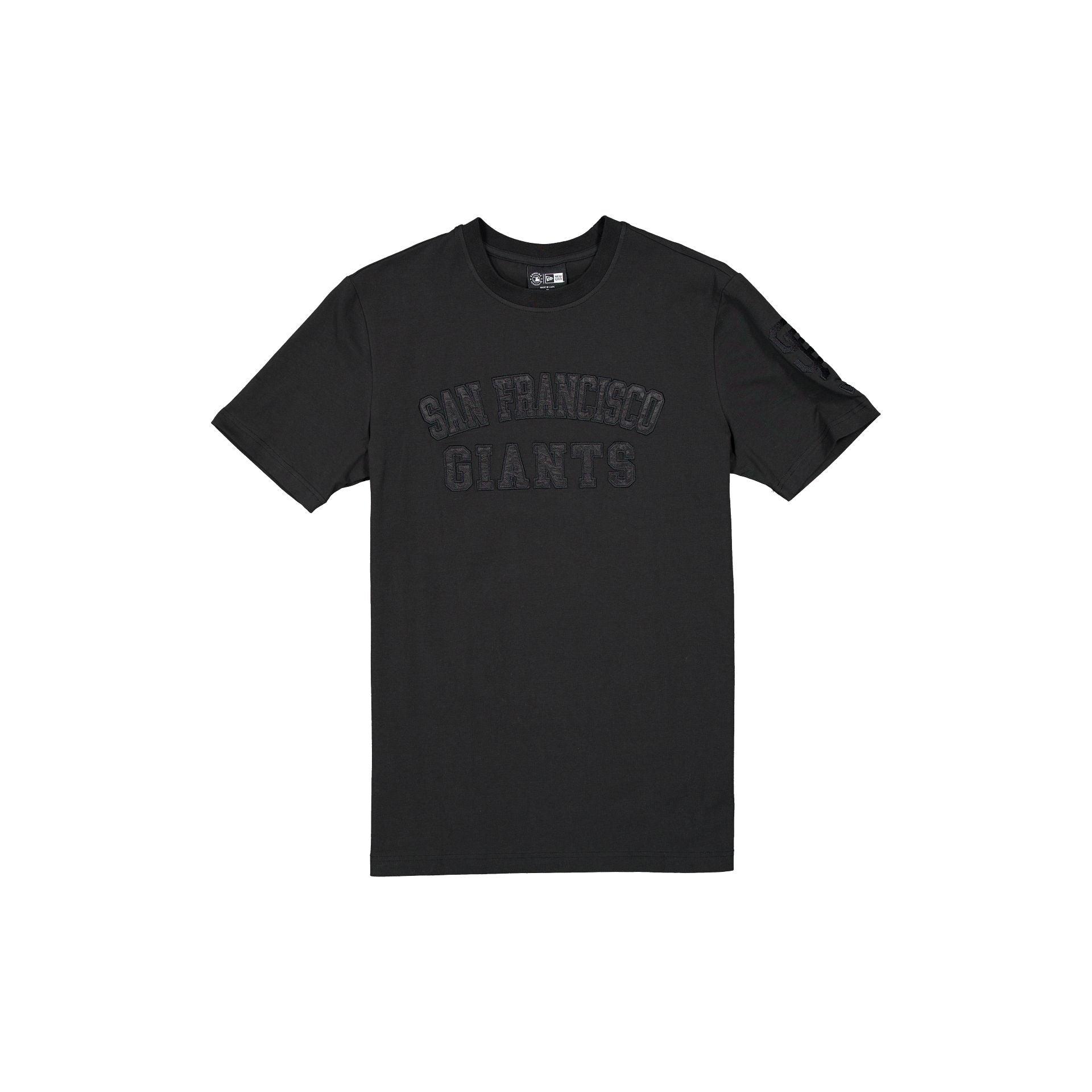 The San Francisco Giants Black on Black Logo Select T-Shirt features a satin applique with a tonal stitch Giants wordmark at the chest and an embroidered team logo at the left-wear sleeve.Fabric: 93% Cotton, 7% Spandex