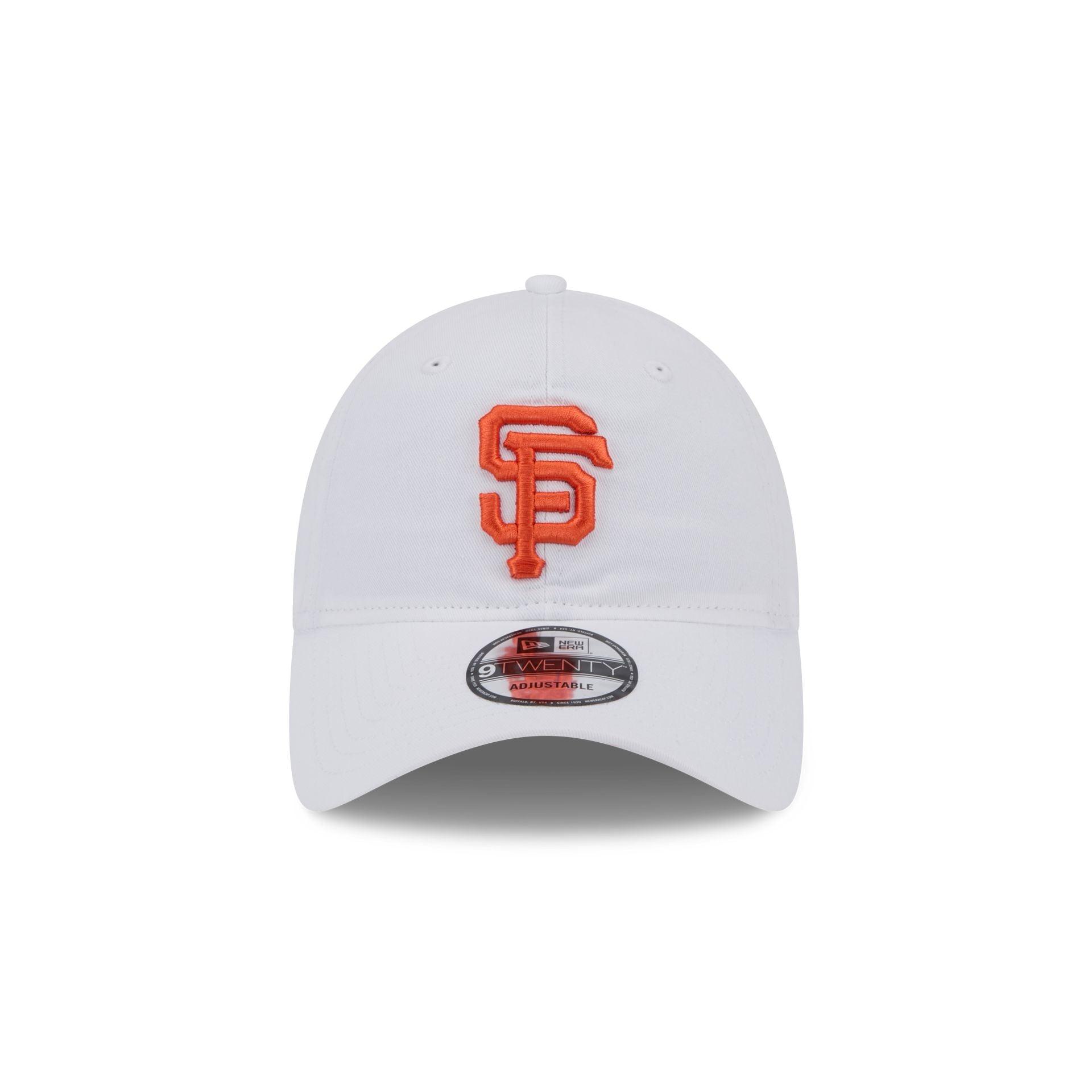 The San Francisco Giants White 9TWENTY Adjustable Cap features an embroidered Giants logo at the front panels with a matching woven team logo tag at the adjustable D-Ring closure at the rear.