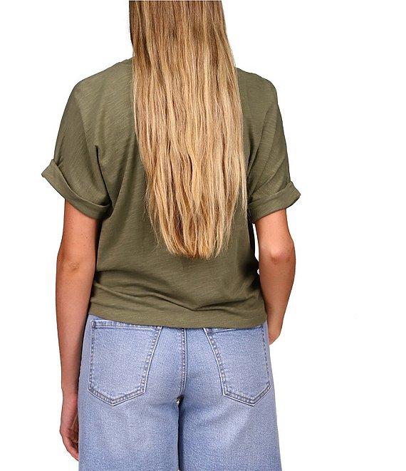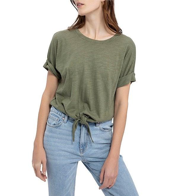 From Sanctuary, this tee shirt features: Crew neckline Short rolled sleeves Tie front Relaxed fit Pullover construction Approx. 21" front BCI cotton/rayon Machine wash Imported.