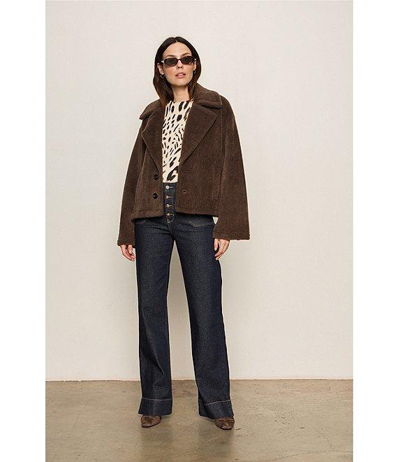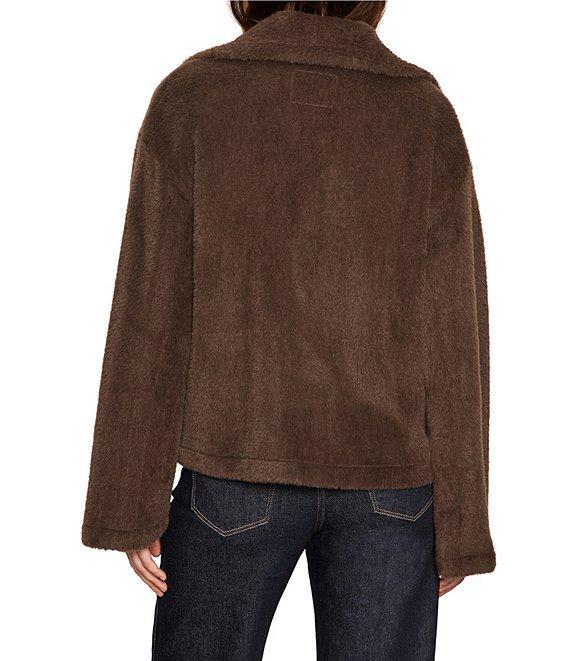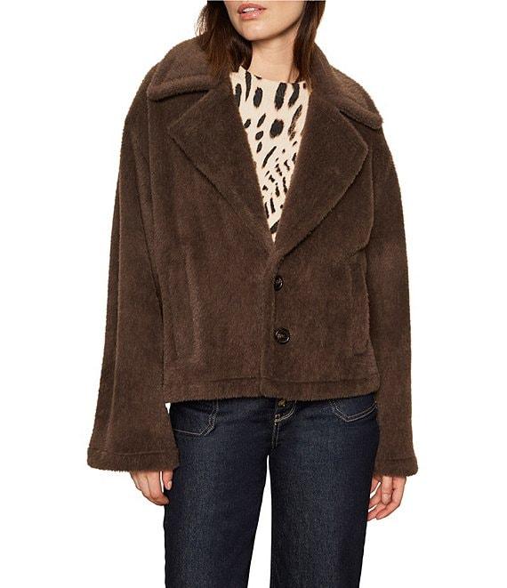 From Sanctuary, this jacket features: Faux fur fabrication Notch lapel neckline Long flare sleeves Front slit pockets Relaxed fit Straight hemline Button front closure Approx. 23" length Nylon/polyester/rayon Machine wash/line dry Imported.