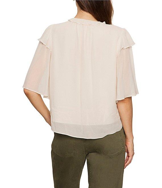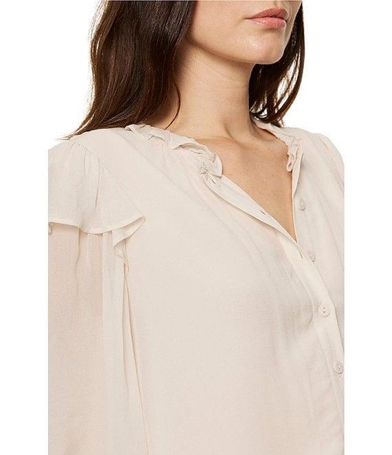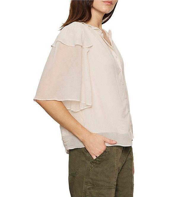 From Sanctuary, this blouse features: Viscose georgette fabrication Round ruffle neckline Ruffle short sleeves Button front closure Lined Straight hemline Approx. 23.50" length Shell: viscose Lining: polyester Handwash cold/line dry Imported.