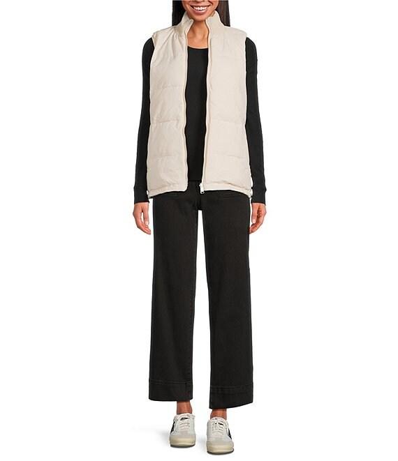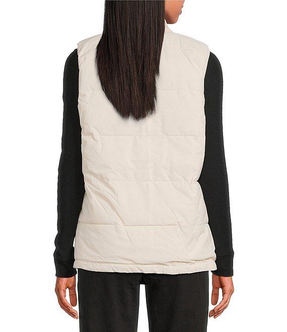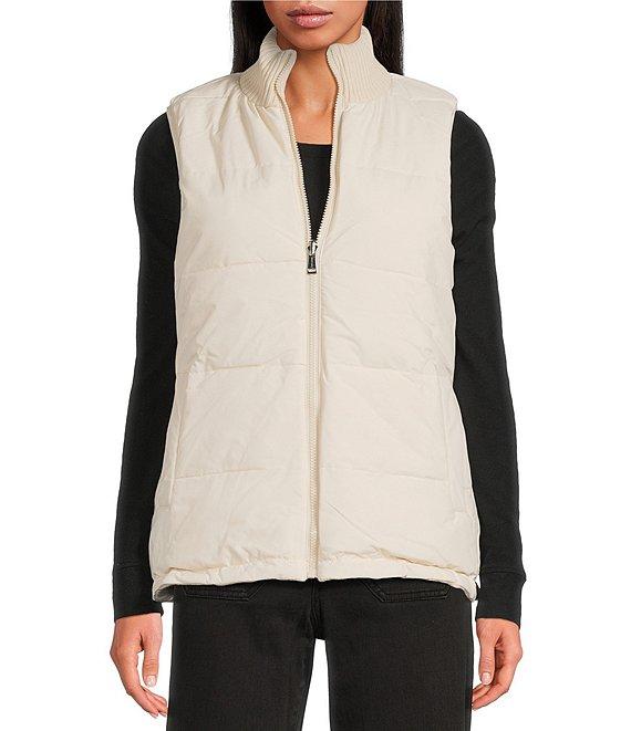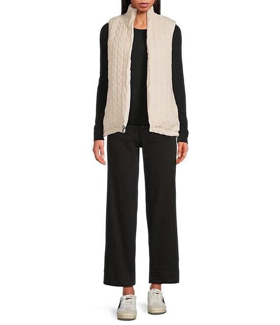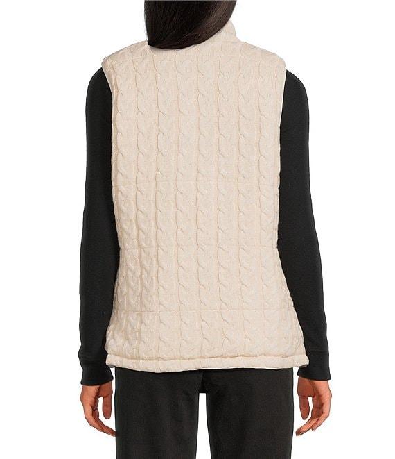 From Sanctuary, this vest features: Cable knit fabrication Chunky rib knit stand collar neckline Sleeveless Side seam pockets Elastic binding at armhole Cable knit reversible to matte stretch vest Straight fit Lined Straight hemline Center front zip closure Approx. 26" length Viscose/polyester/nylon/coated polyester matte stretch Machine wash Imported.