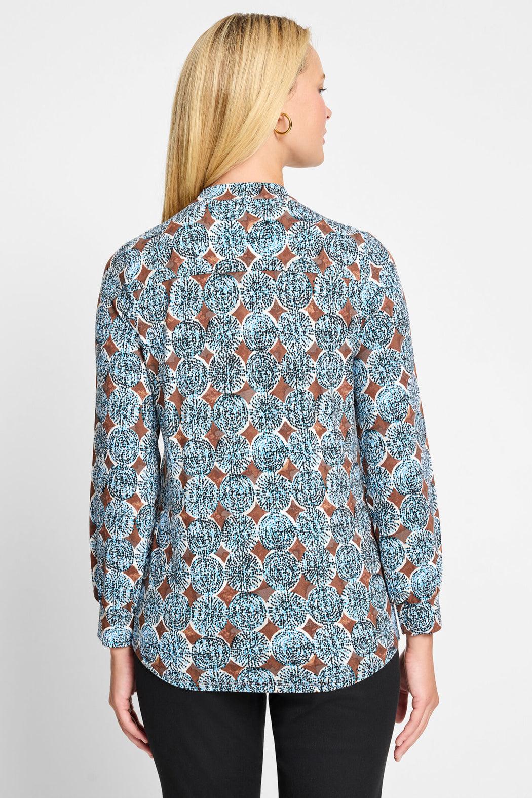 Your next great beach find: whether or not you're actually on the water. This easy split neck top features an intricate indigo print, split button placket, and long sleeves with a bit of shape at the cuffs. Dress her down with denim or pair off with skirts or tailored work pants. Knit from 95% drapey viscose, with just a touch of added stretch to keep things comfortable as a day at the beach.