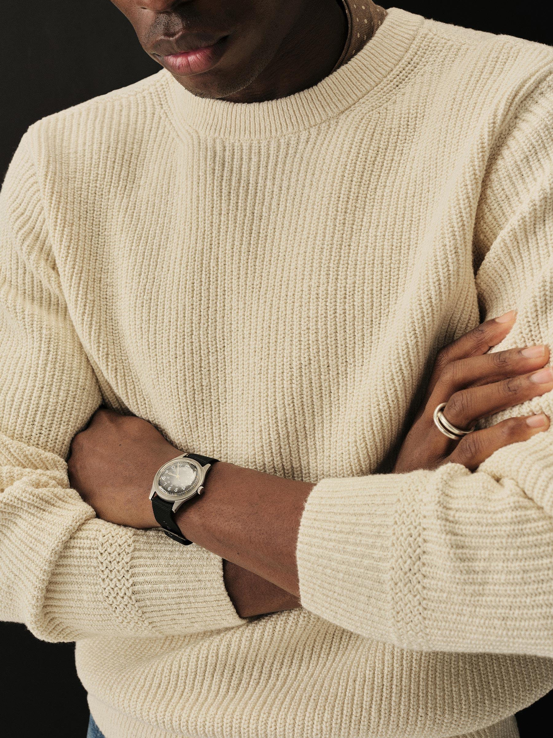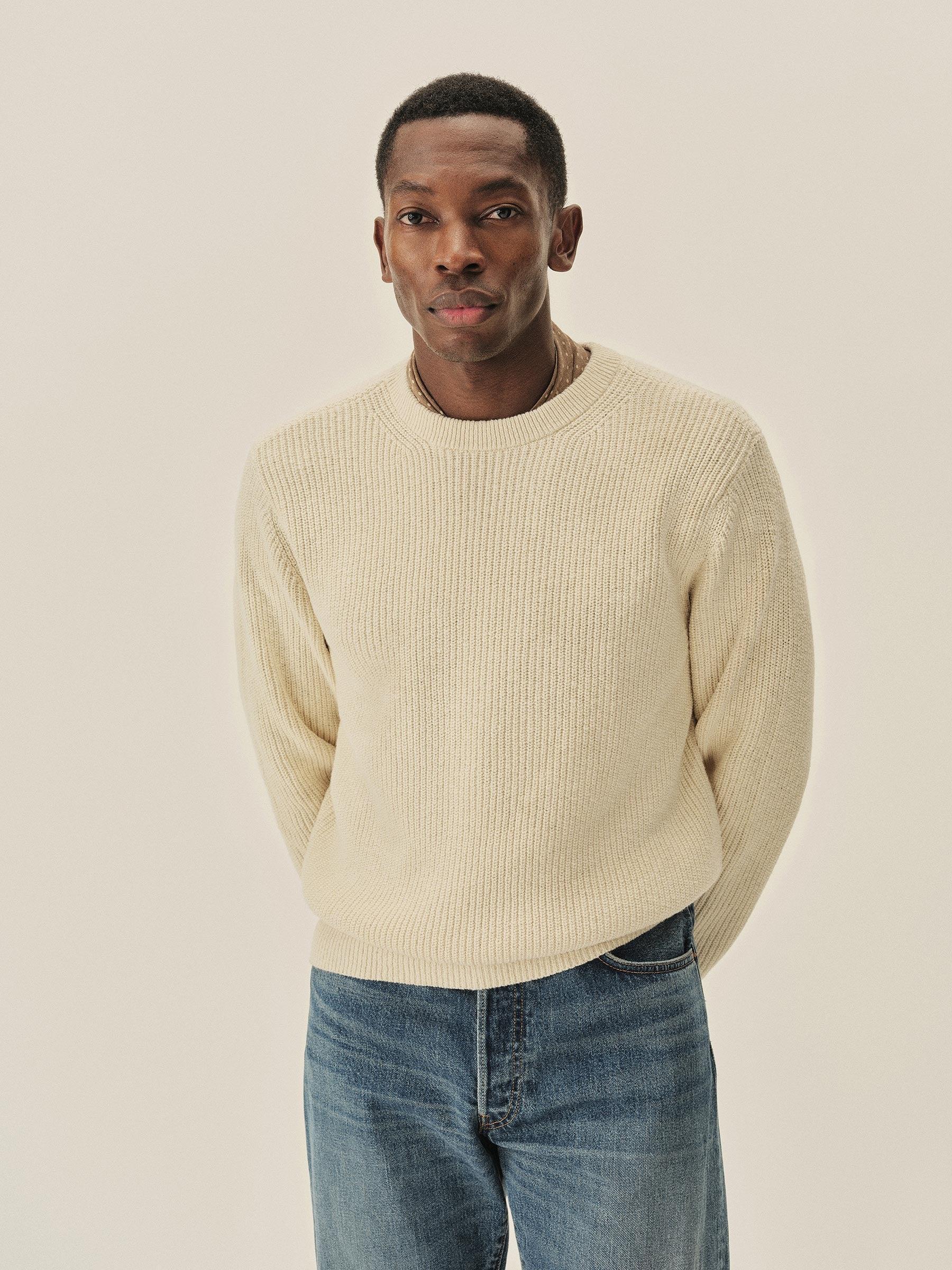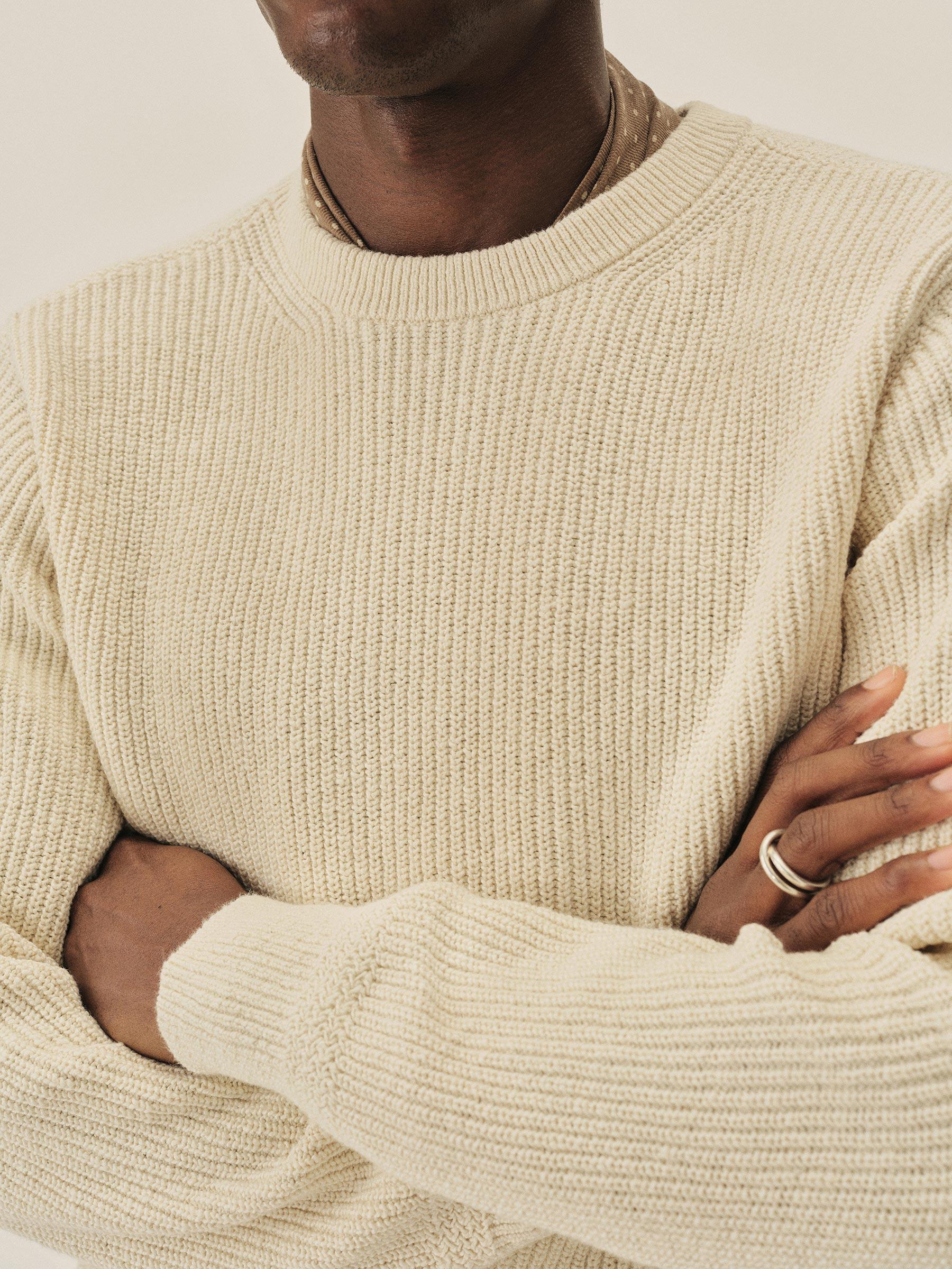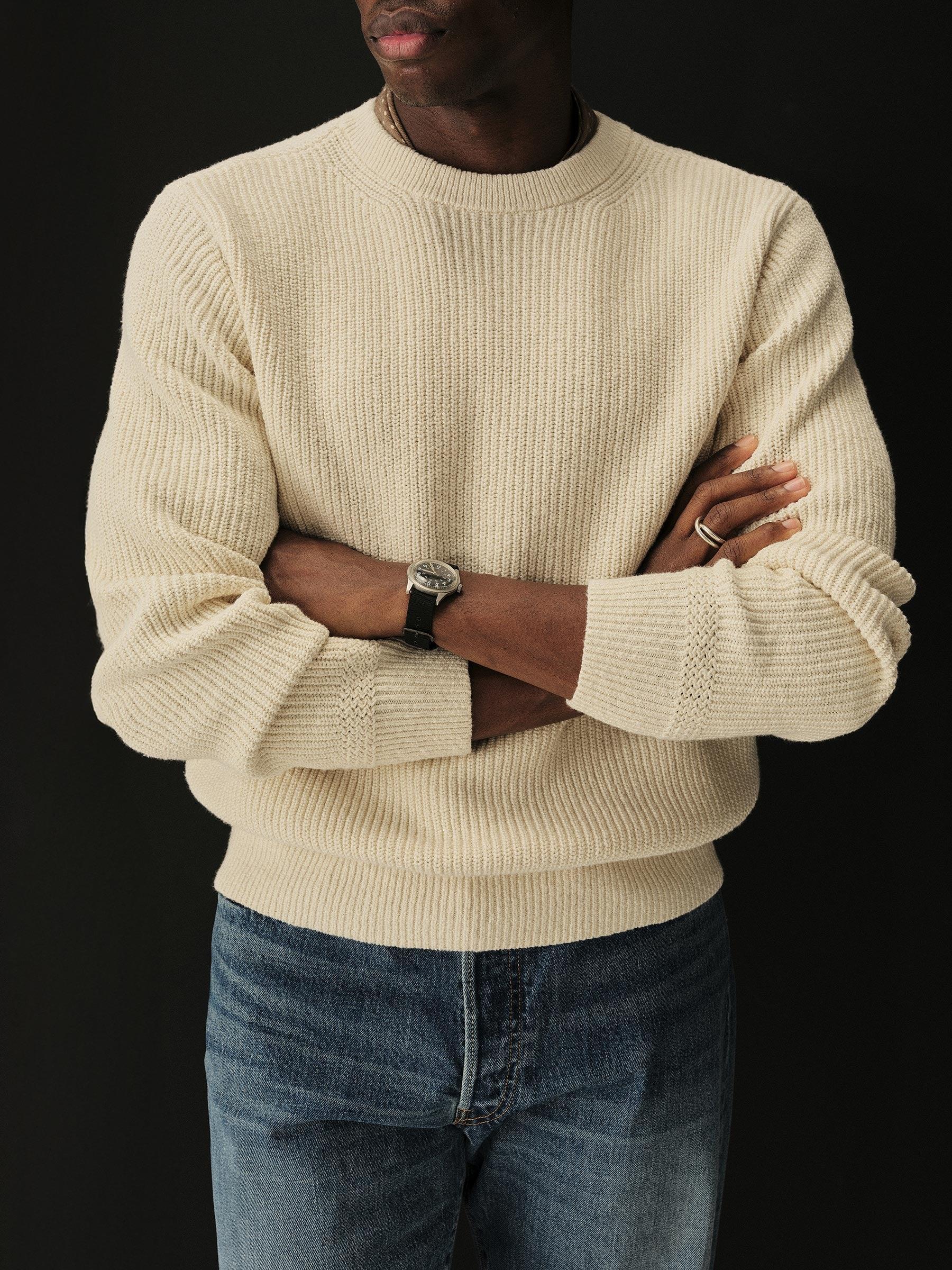 Jersey knit crewneck sweater in richly textured homespun cotton rib. Ideal for year-round wear.