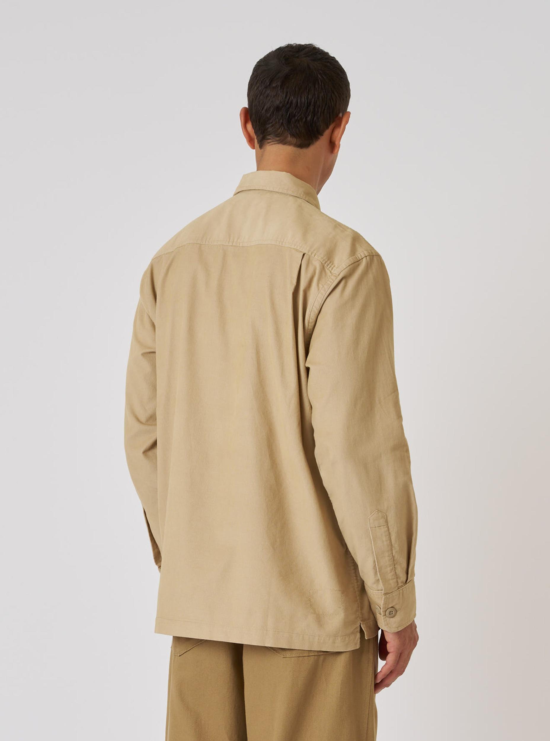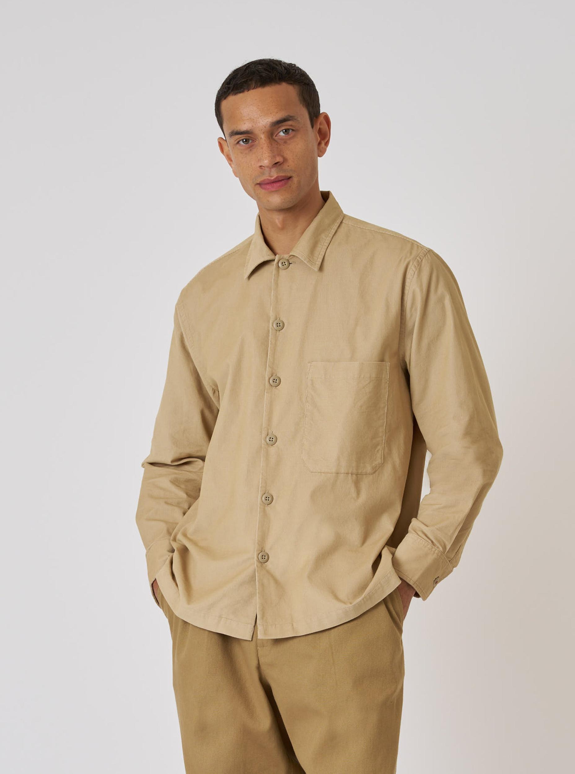 A relaxed, loose, over-shirt style, with a one-piece, simple collar; a single, large, square chest pocket; a shirt cuff and straight hem, designed to be worn over and out.