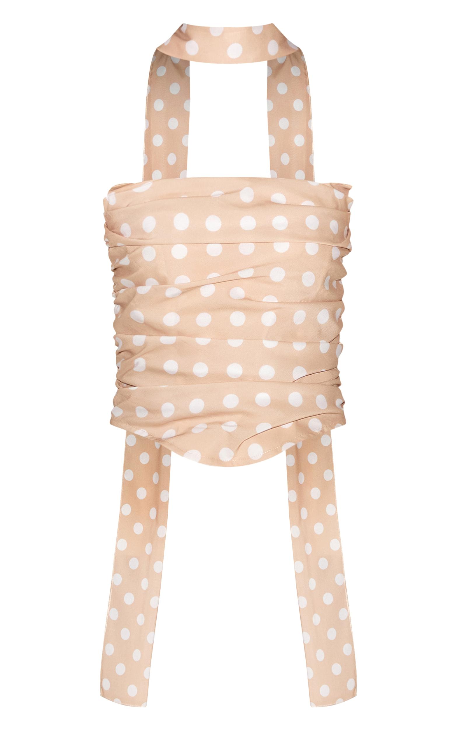 An artful print meets a defining shape for evening. This sand polka sot printed scarf detail corset brings confident structure to your look with its fitted strapless cut and clean curved hem. The sand base is scattered with a white polka dot print, while the draped scarf detail offers a unique finish – tie it as a neck strap or let it hang for effortless style. This piece holds its structured shape. Finish the edit with sleek black pants or a sharp mini skirt and heels for a knowing night out.Length approx 48.5cm/19inch (Based on sample size US 4)Model wears size UK 8/ EU 36/ AUS 8/ US 4Model Height - 5ft 7inchp]:!mb-4inch>Brand: PrettyLittleThingCategory: TopsProduct type: CorsetColor: SandMaterial: SatinDesign: PrintNeckline: BandeauSleeves: SleevelessOccasion: Evening