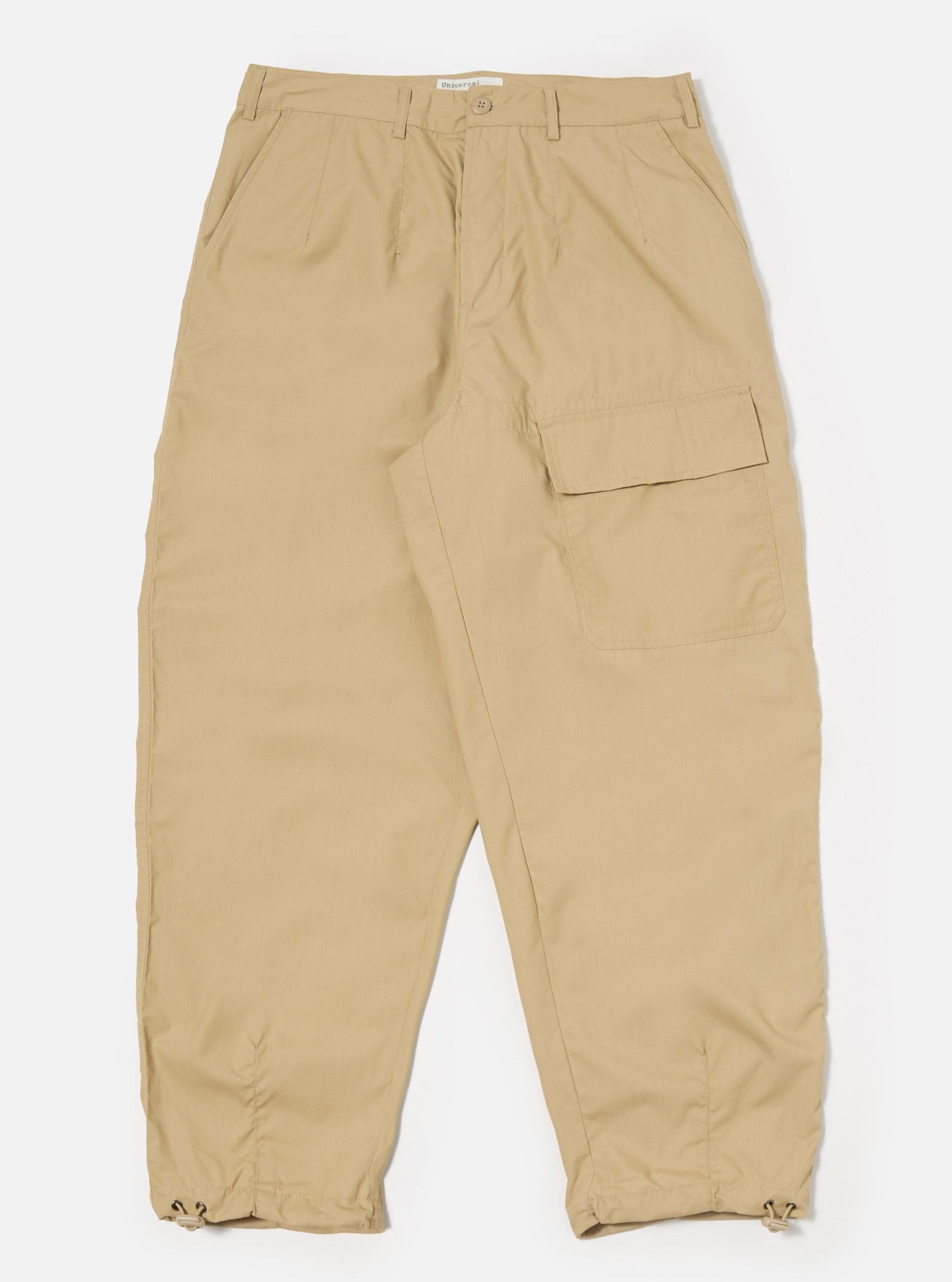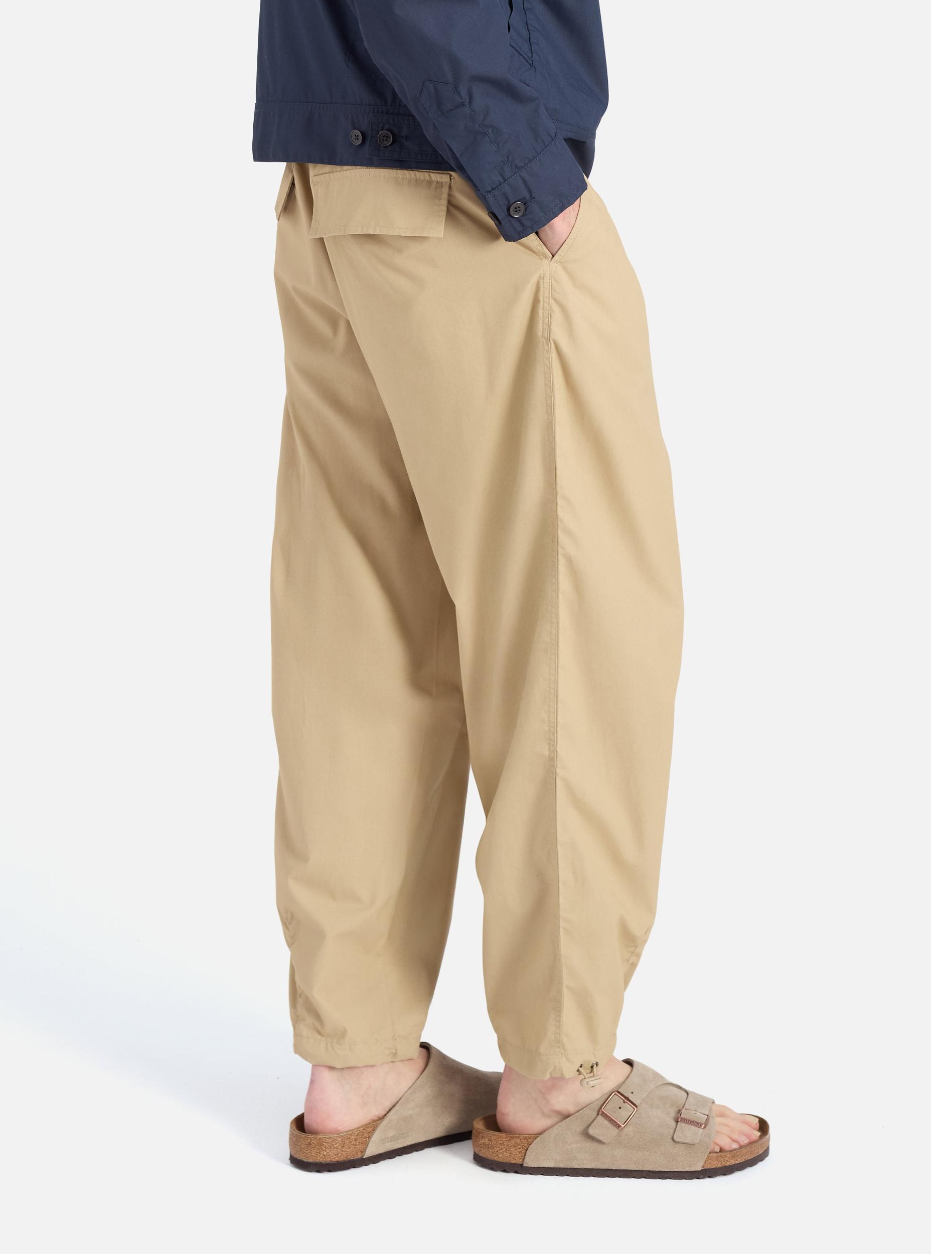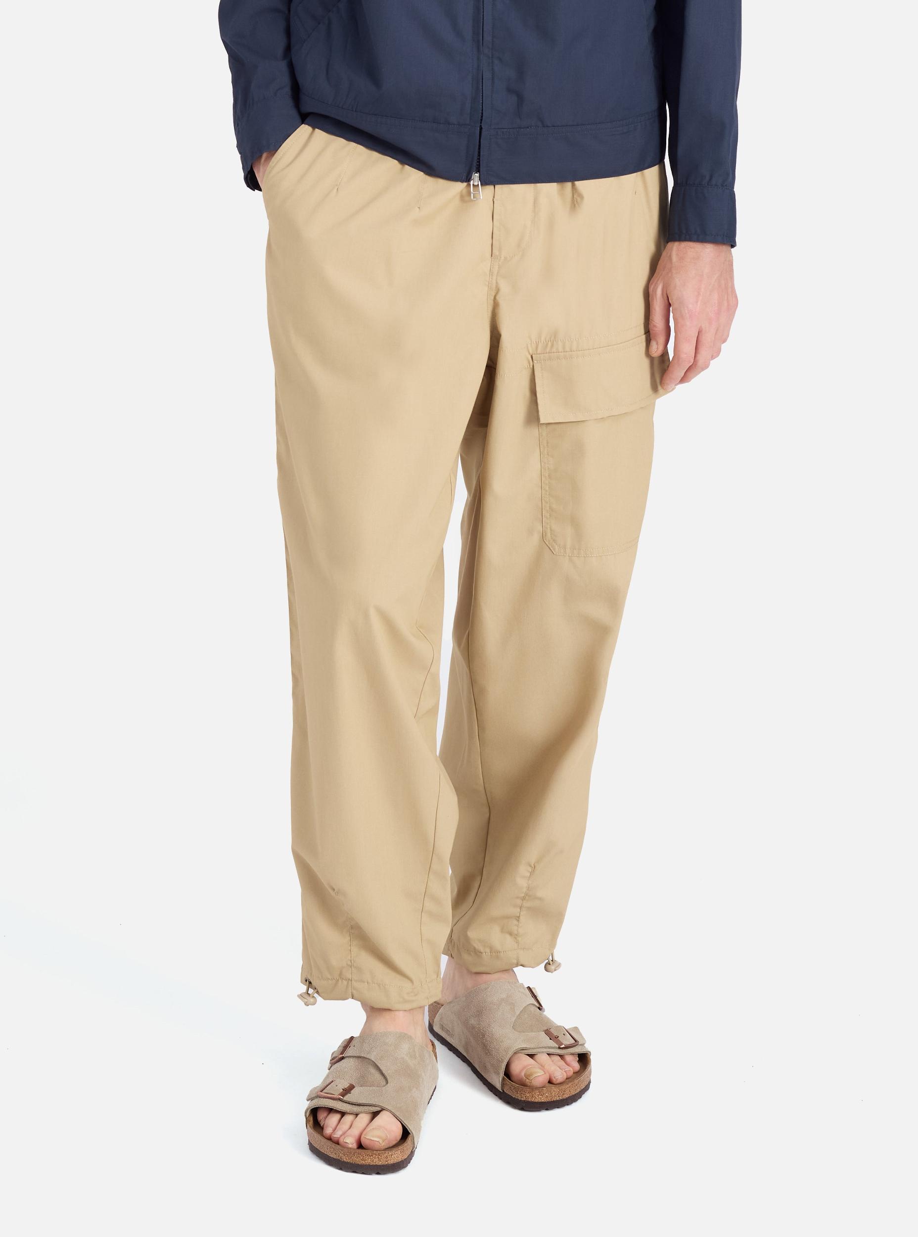 The same shape as our loose cargo trousers, with a change to the pocket—we have added this one to the front. These have waist adjusters, and drawcord hems. Our model is 6' 2'' with a 31.5’ Waist and is wearing a size ‘32.’ Woven from recycled polyester fibres and cotton, this compact fabric has a clean, utilitarian look. Lightweight but extremely durable, it is comfortable, quick drying, and practically immune to creases—so it is great out of the bag, wardrobe or suitcase. • Loose fit. • Side buckle waist adjusters. • Two back flap pockets. • One front leg pocket. • Button fly. • Darted hem and drawcord. • Fabric Composition: 65% Recycled Polyester, 35% Cotton. • Washcare: Wash at 30 degrees. Do not bleach. Do not tumble dry. Cool iron. Do not dry clean. Wash like colours together. Do not iron decoration. • Please be aware that the measurements above are technical measurements that are based on the garment laid flat and are useful as a general guide only. Measured in Centimetres. 26 28 30 32 34 36 38 Outside Leg Including Waistband. 101 101 103 108 111 111 111 Waist. 36 38.5 41 43.5 46 48.5 51 Thigh - 2.5cm Below Crotch. 35 36.5 38 39.5 41 42.5 44 Hem Opening Width. 23 23 23 24 25 26 27 Front Rise Including Waistband. 29 30 31 32 33 34 35 Back Rise Including Waistband. 44 45 46 47 48 49 50