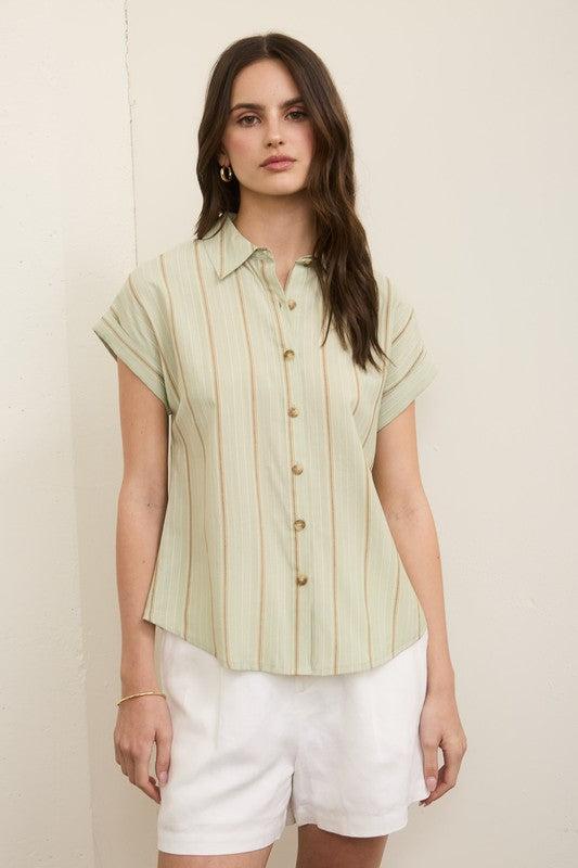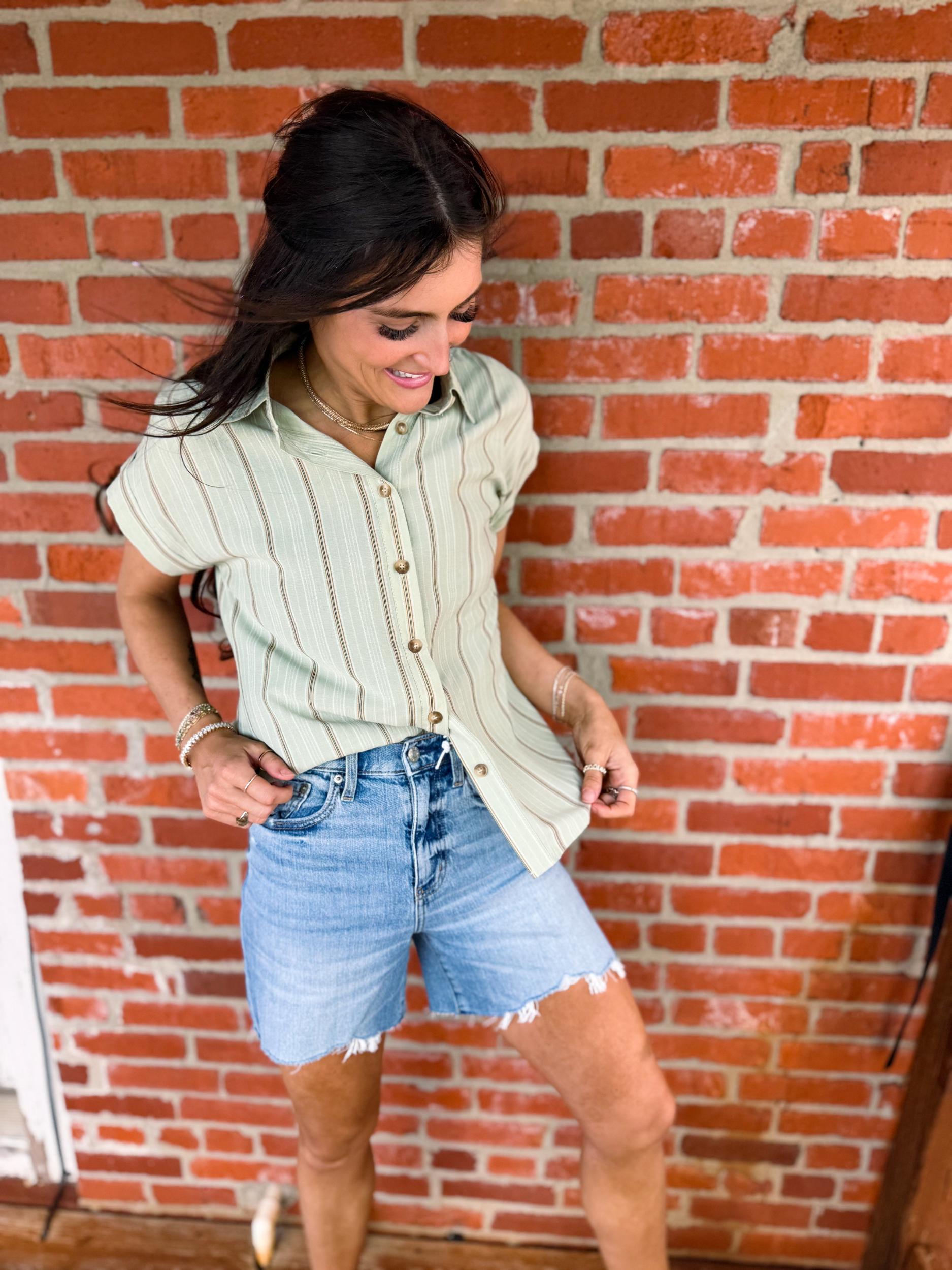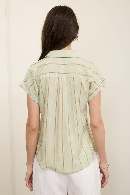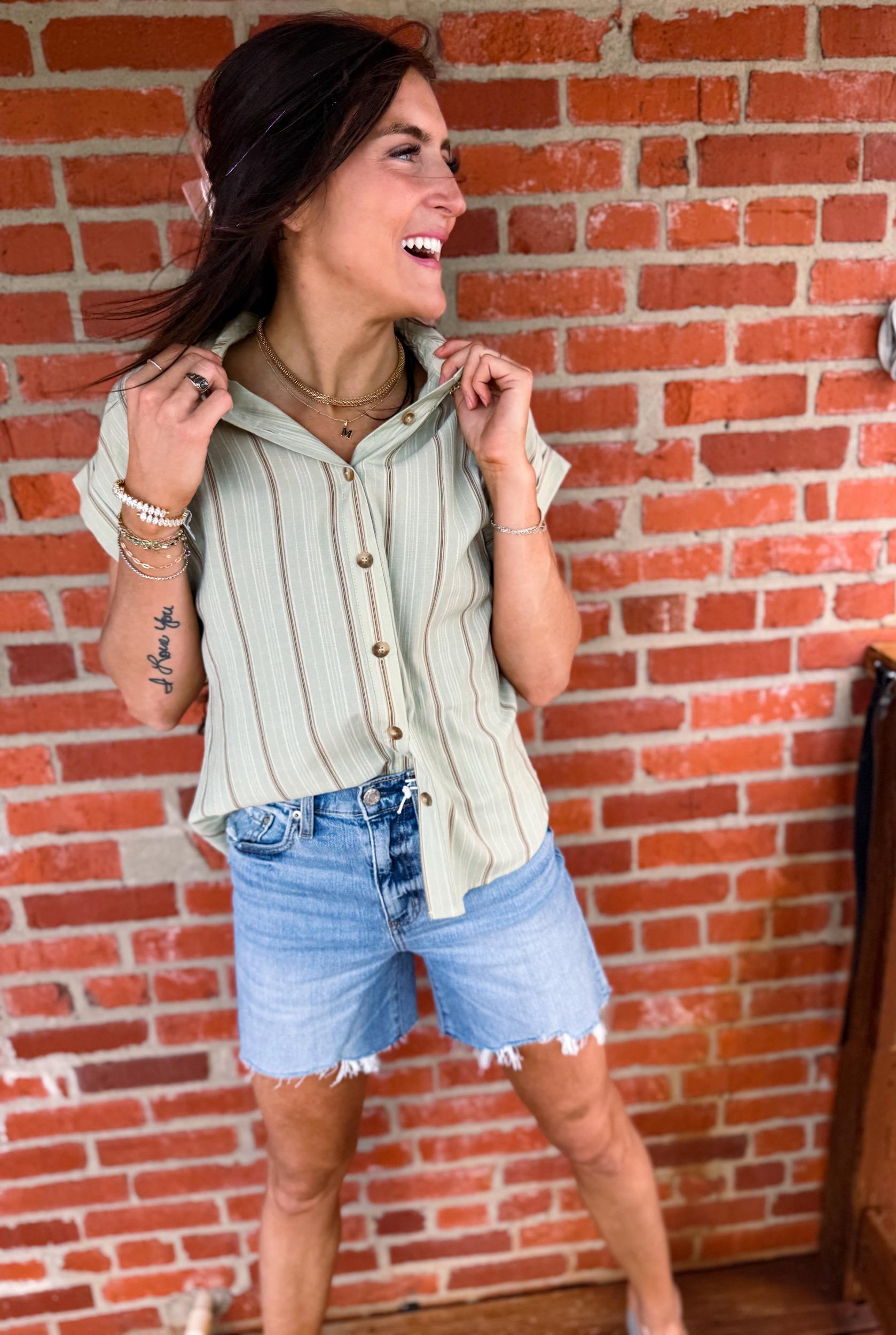 Bring a splash of color to your wardrobe with the Sand & Sage Button Up! This woven top features a fun multicolor pinstripe pattern, relaxed fit, and cuffed short sleeves for easy breezy style. The collared, button-down design with functional buttons adds a classic touch while keeping things playful and fresh. Perfect for sunny days or layering up with your favorite jacket!