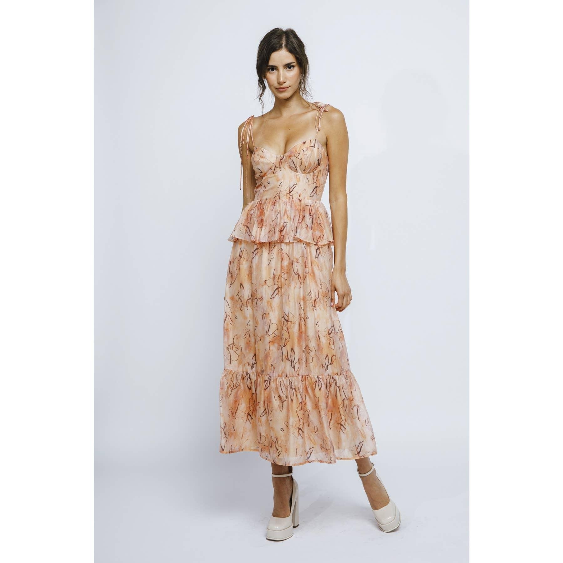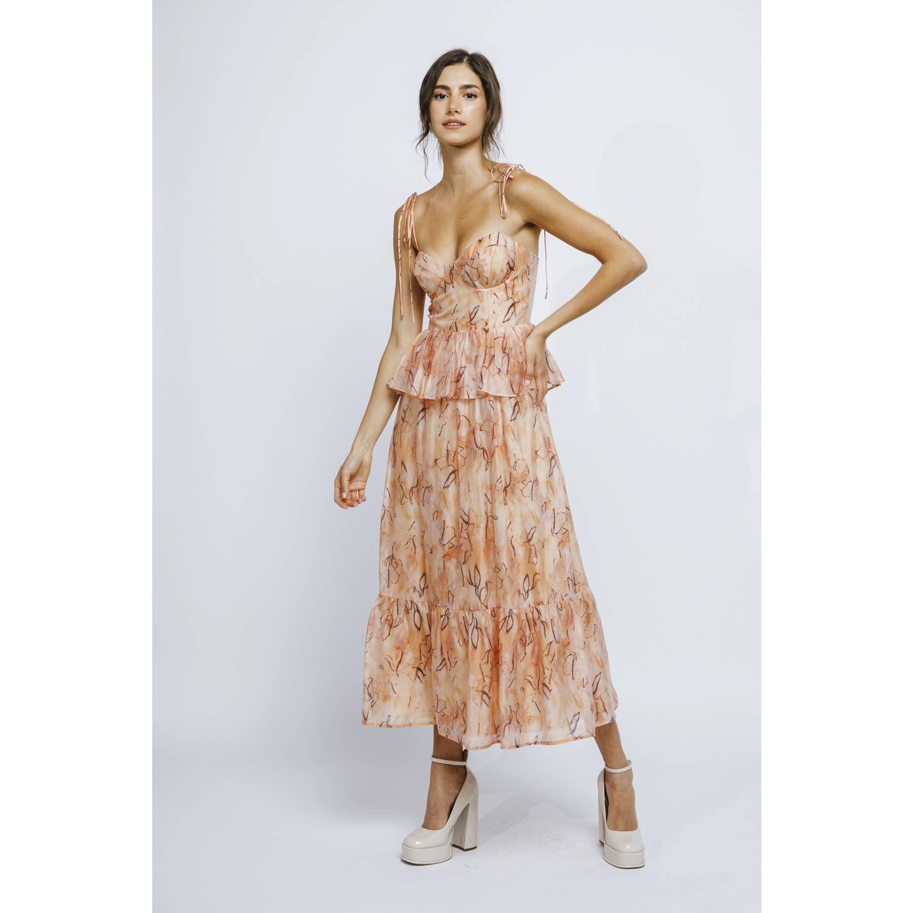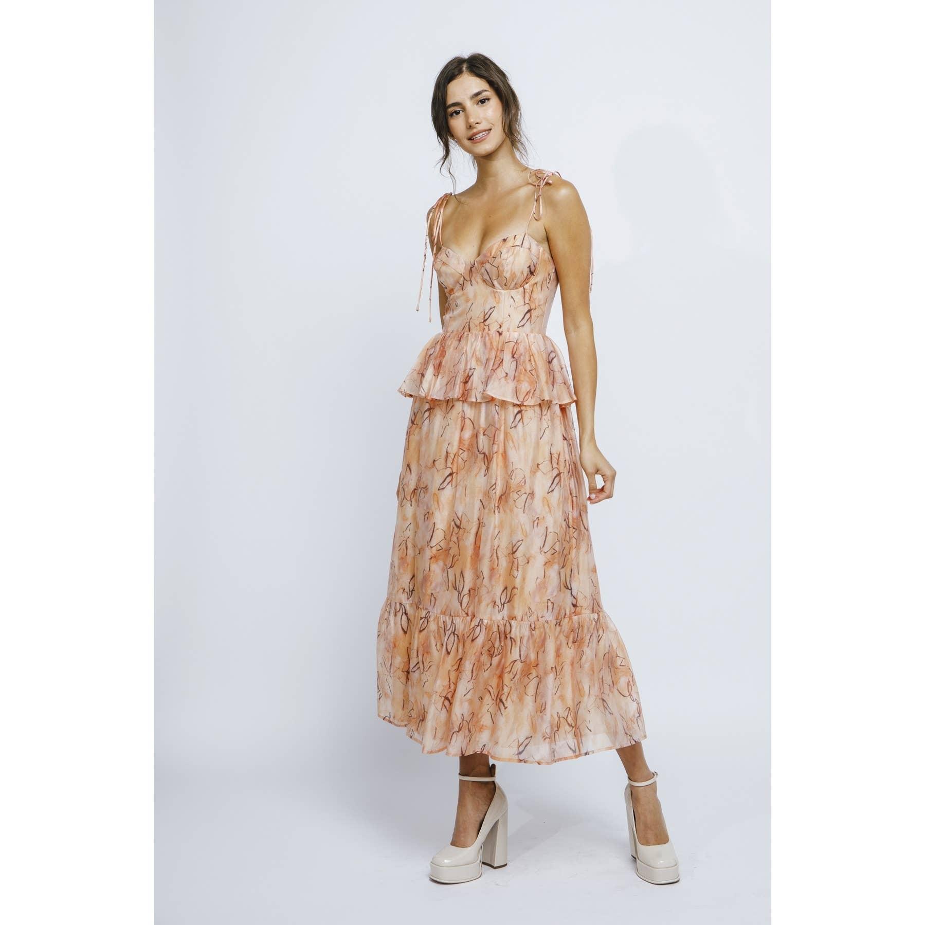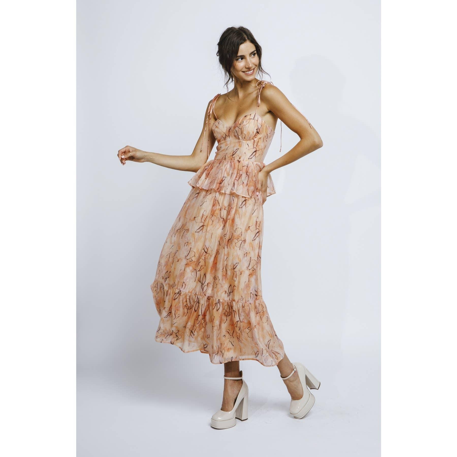 Abstract print and dyed ruffled peplum midi dress. This dress features a fitted bustier top, self-tie spaghetti straps, a smocked upper back, and an invisible zipper. It also has peplum ruffles around the waist, and the midi bottom has a ruffled hem