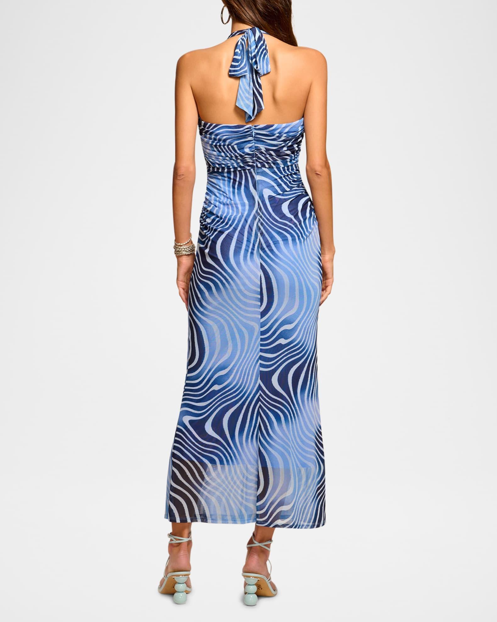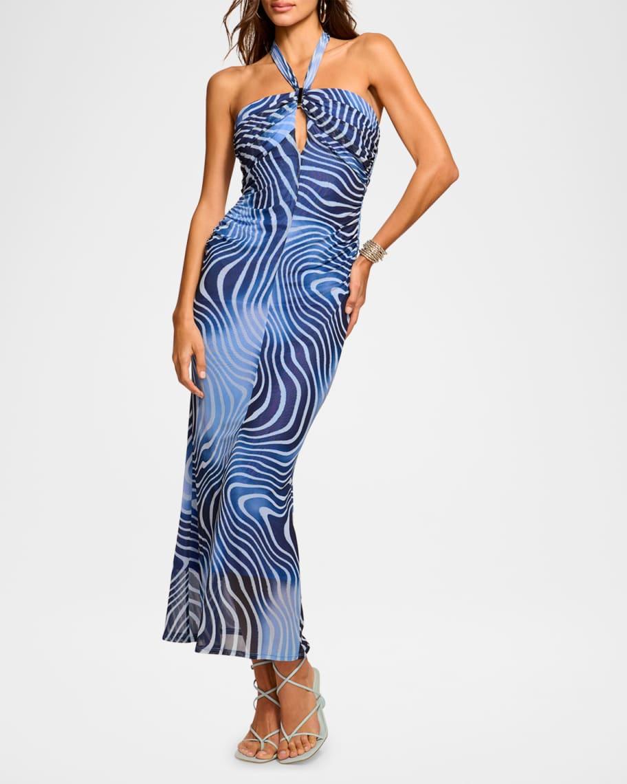 Ramy Brook "Sandie" swirl-printed dress with a front keyhole cutout Approx. 42"L from shoulder to hem Halter neckline; self-ties behind the neck Sleeveless Hem falls below the knee Body-skimming silhouette Invisible back zipper Polyester Dry clean Imported Model is 5'10"/177cm.