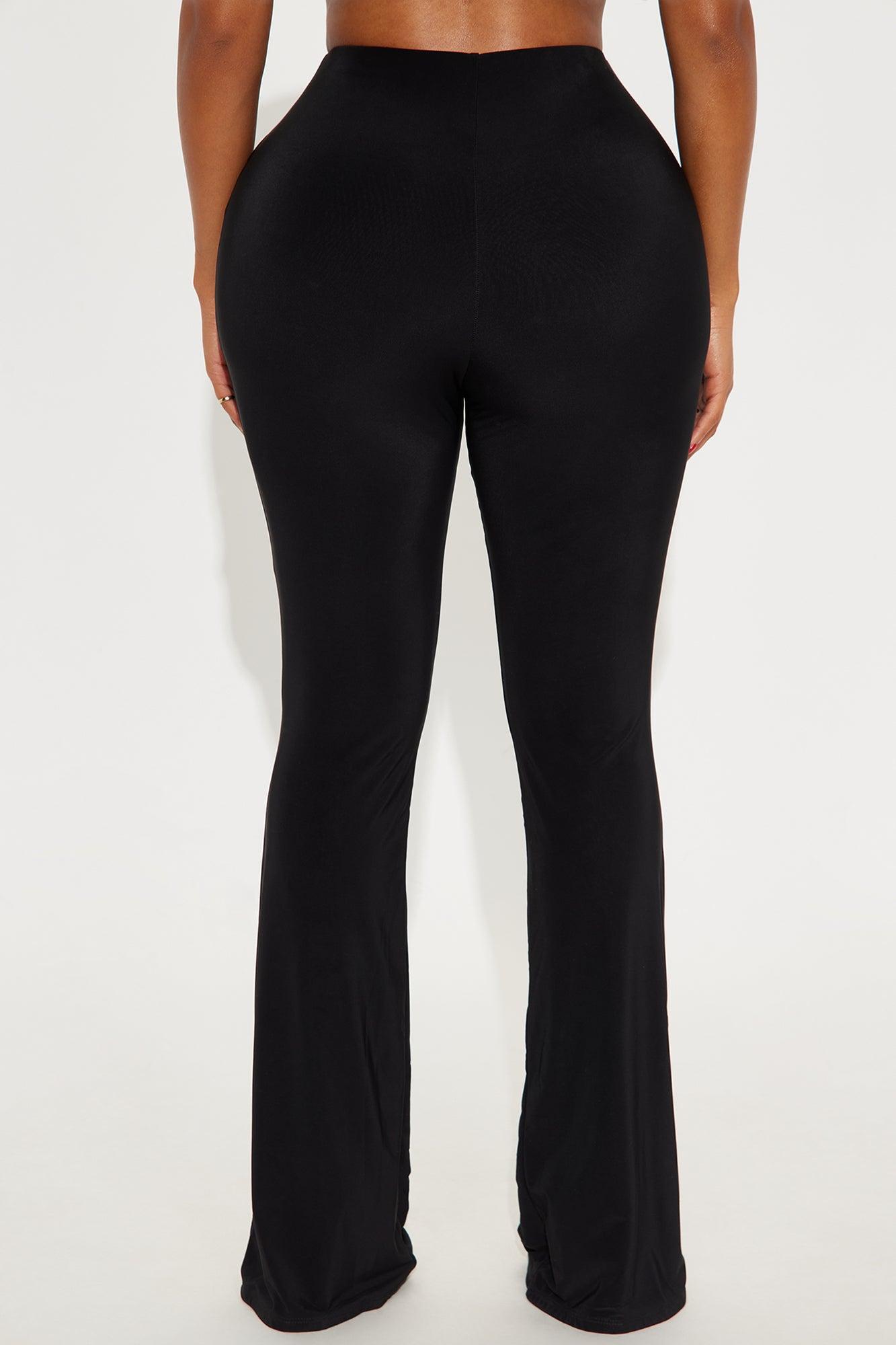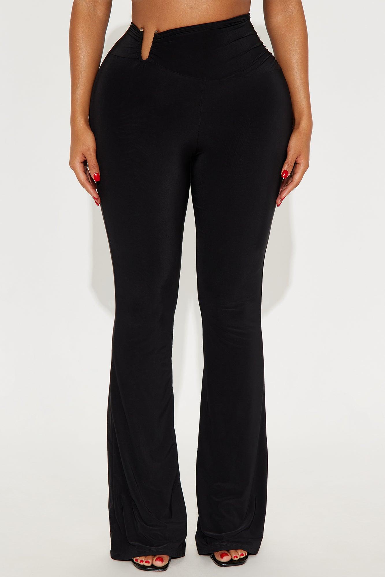 Available In Black. Flare Pant Stretch Regular 34" Inseam High Rise Partial Elastic Waistband Hardware Detail Ruched Detail Double Lined 95% Polyester 5% Spandex Imported California Proposition 65WARNING: Cancer and Reproductive Harm - www.P65Warnings.ca.gov.