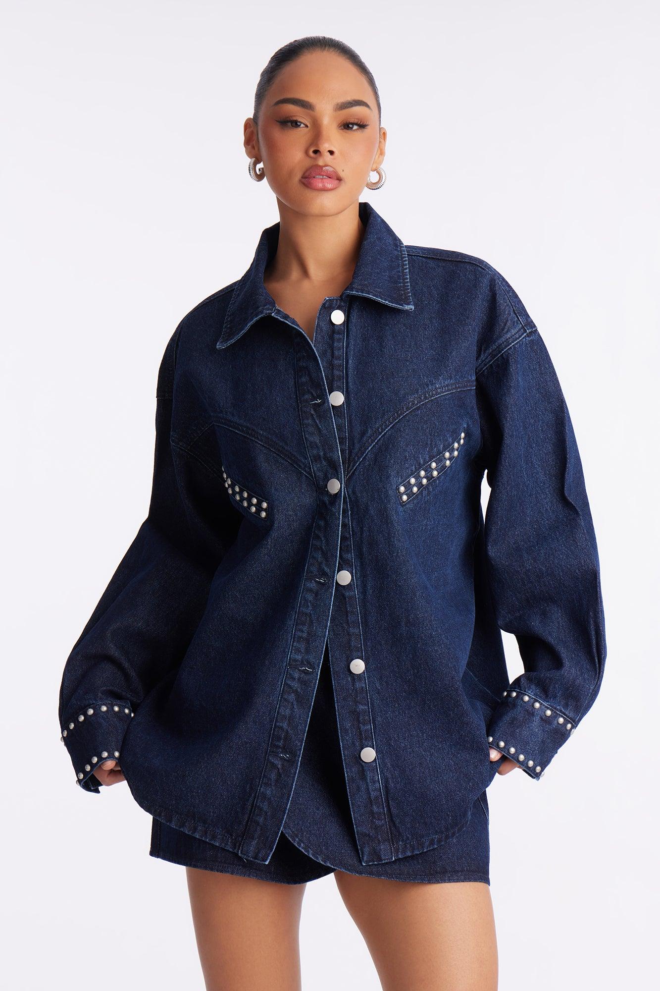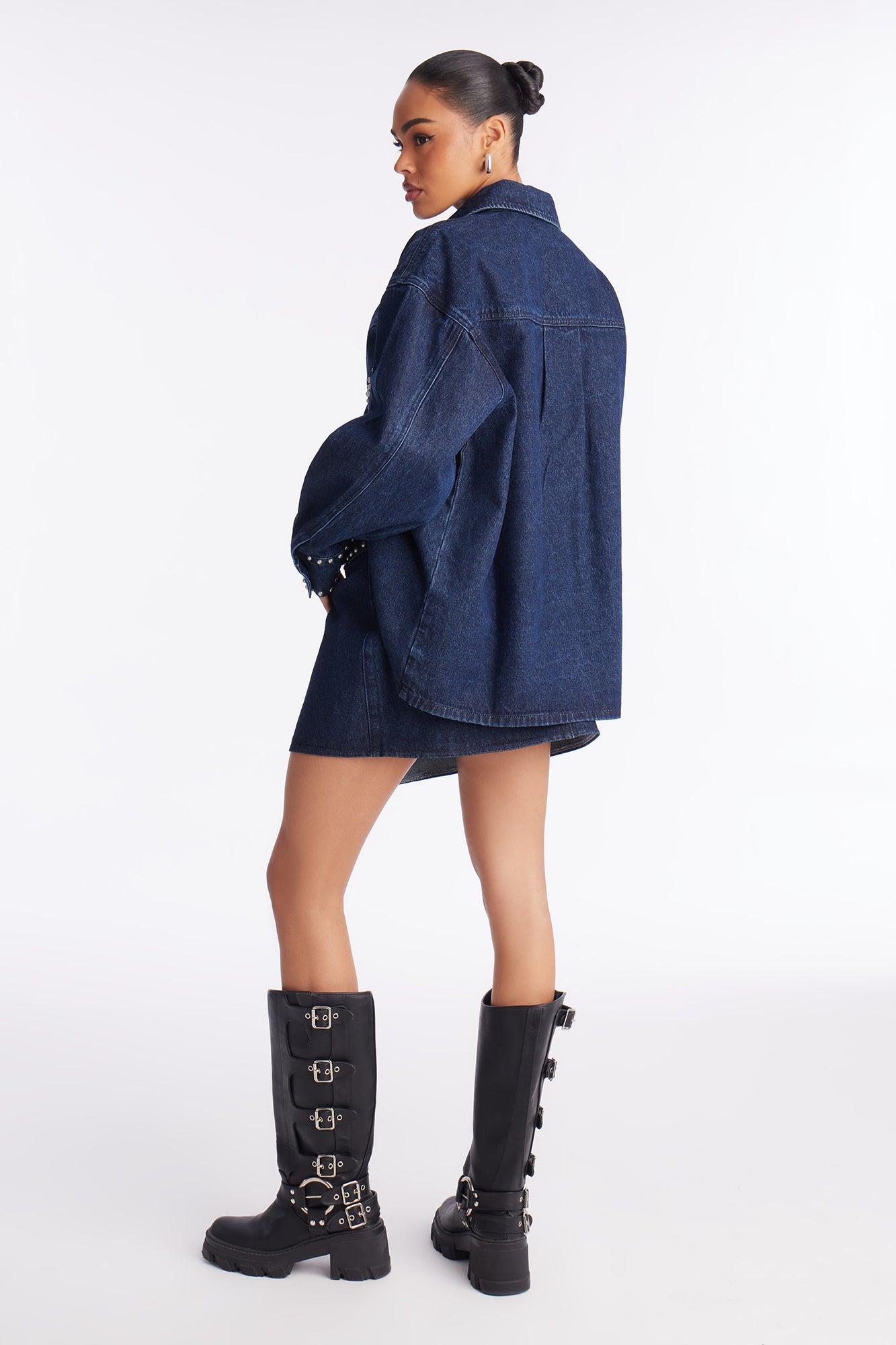 Available In Dark Wash. 2 Piece Ensemble Button Up Shirt And Mini Skirt Set Non Stretch Skirt Length 13.5" Front Button Closure On Skirt Skirt Front Wrap Detail Disclaimer: Due To The Specialized Wash, Each Garment Is Unique. 100% Cotton Imported California Proposition 65WARNING: Cancer and Reproductive Harm - www.P65Warnings.ca.gov.