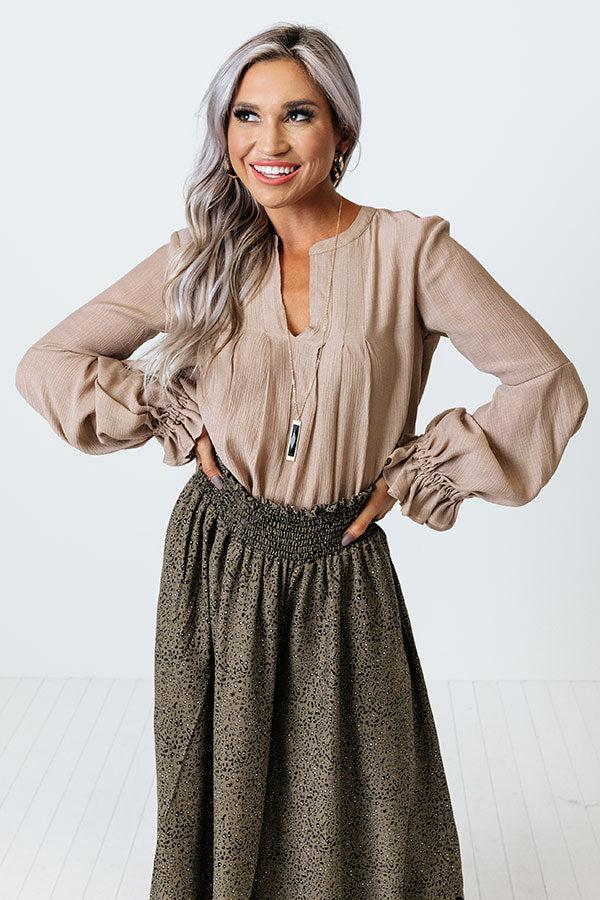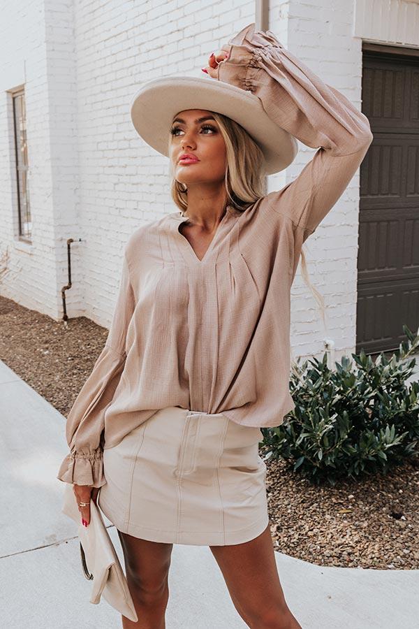 Stay chic in this classy taupe colored shift top featuring lightweight breezy material, a v-cut neckline, long loose bishop sleeves with flared ruffle cuffs, and a relaxed silhouette that falls into a rounded hemline! Measurements S : Bust 38", Hip 44", Length 23.5", Sleeve Length 22", Waist 42". M : Bust 40", Hip 46", Length 24", Sleeve Length 22.5", Waist 44". L : Bust 42", Hip 48", Length 24", Sleeve Length 23", Waist 46". XL : Bust 44", Hip 50", Length 24.5", Sleeve Length 23", Waist 48".