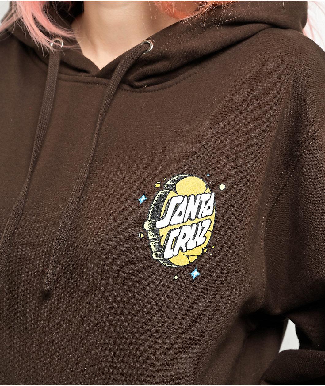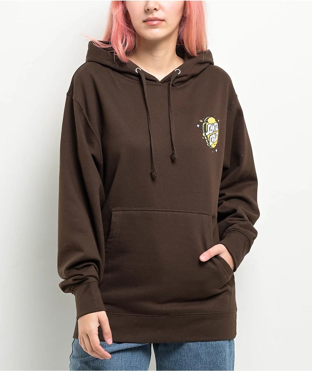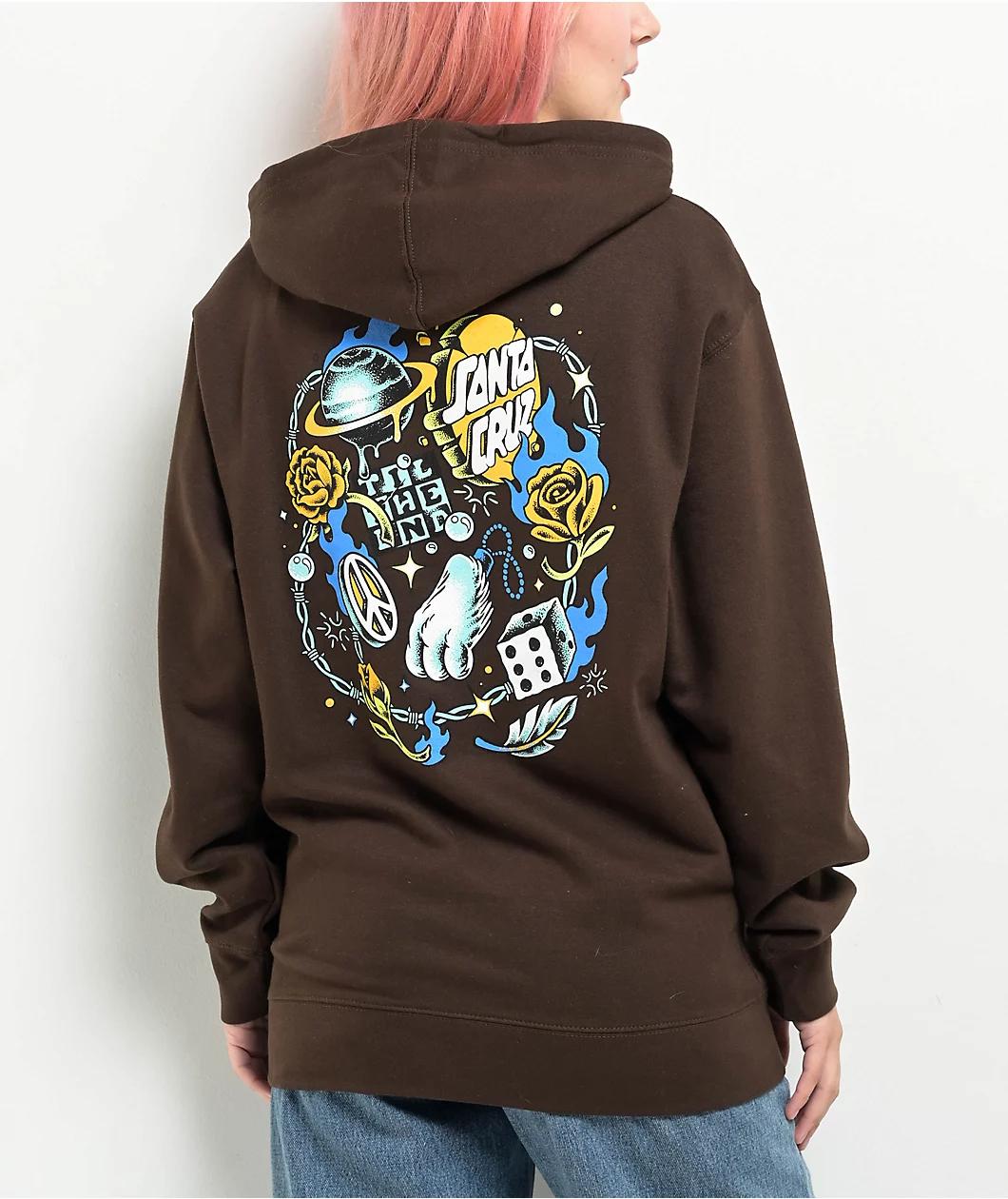 Add a space-age vibe to your outfit with the Lucky Day hoodie from Santa Cruz, arriving in a brown colorway. This sweatshirt has a retro screen-printed logo on the left side of the chest and a loud design on the back, featuring barbed wire, planets,