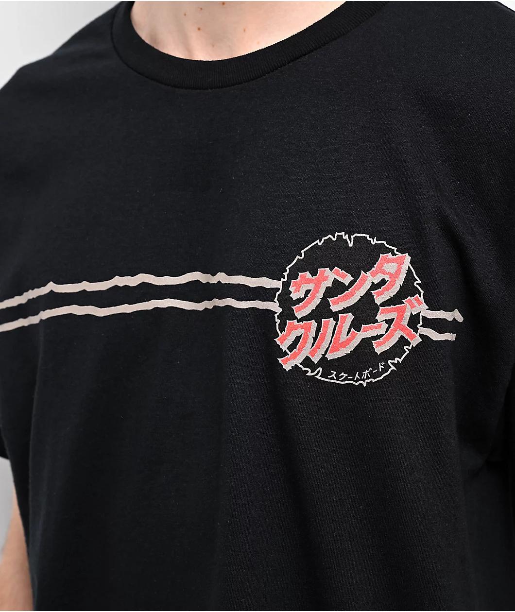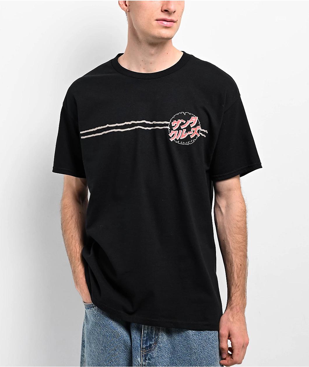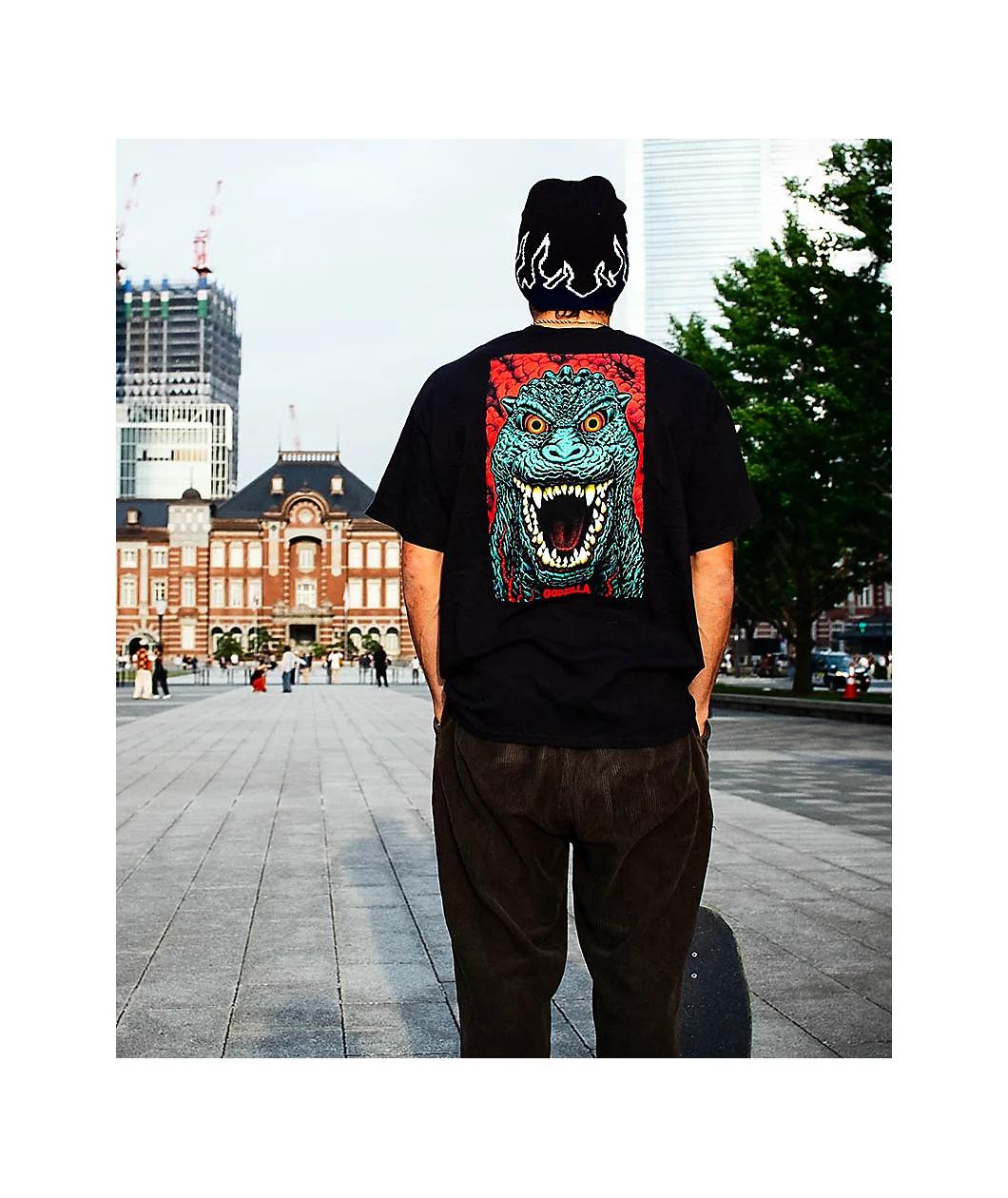 Japanese film monster Godzilla reaches the shores of California to collaborate with Santa Cruz Skateboards, creating the Destroyer t-shirt in a solid black color with printed graphics on the left chest and back. The front of the tee displays a co-bra