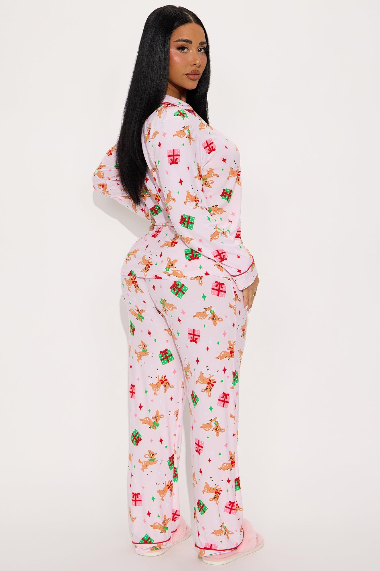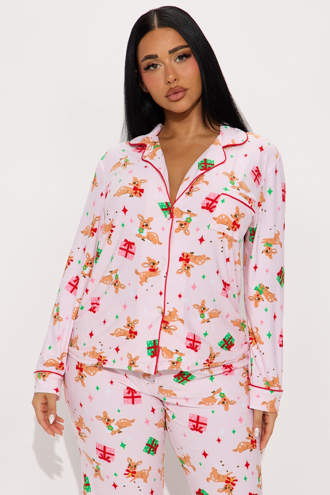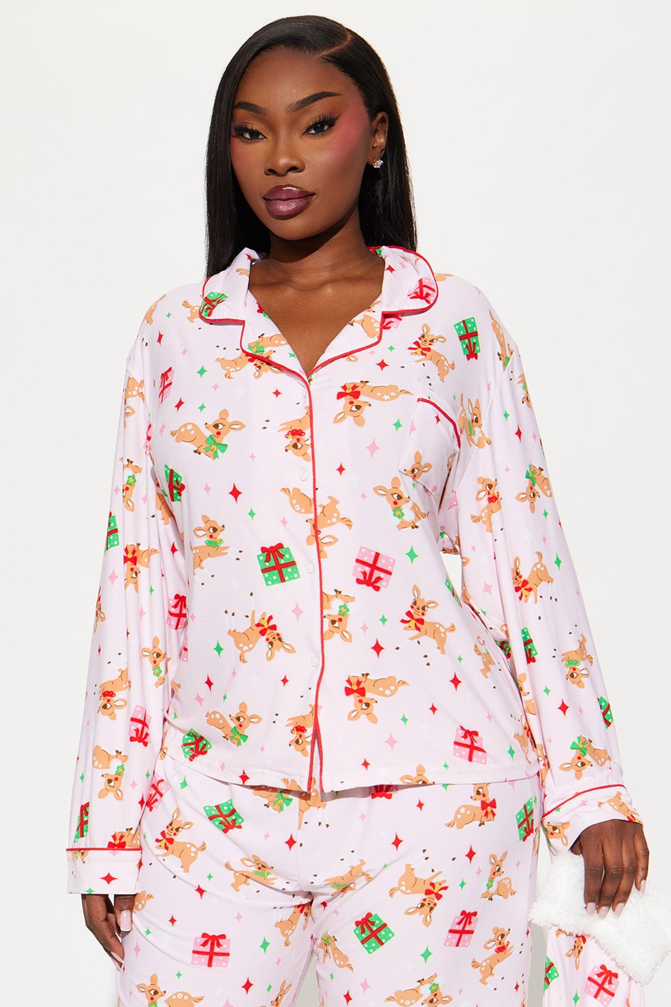 Available In Pink/combo. 3 Piece Set Reindeer Print PJ Button Up Shirt Long Sleeves Chest Pocket Matching Pants Drawstring Stocking Included Stretch Final Sale Disclaimer: Print Placement Will Vary. 95% Polyester 5% Spandex Imported