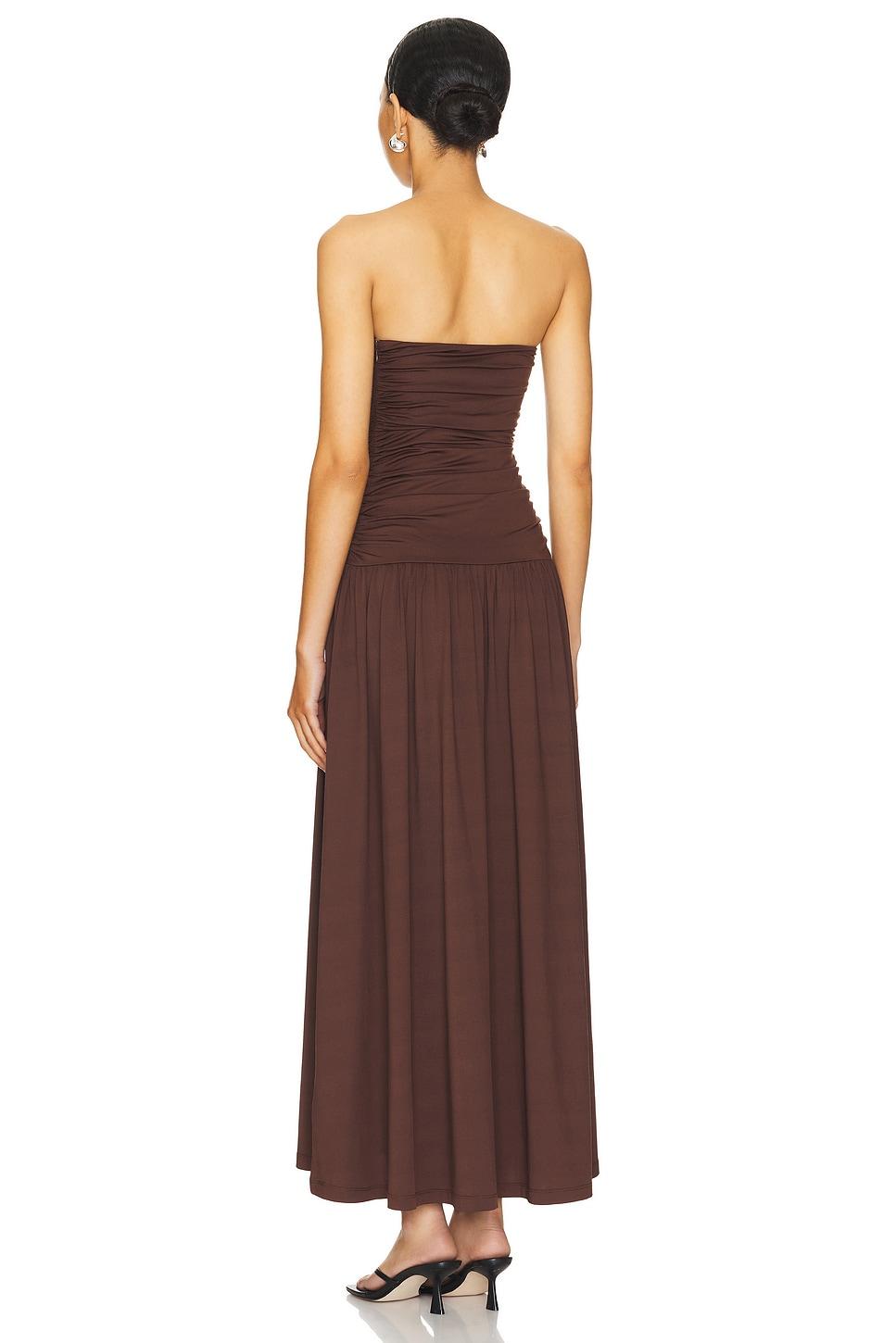 95% polyester, 5% spandex. Made in China. Machine wash. Fully lined. Hidden side zipper closure. Ruched jersey fabric. Neckline to hem measures approx 47" in length. Revolve Style No. NIAR-WD15. Manufacturer Style No. ND-1448R.