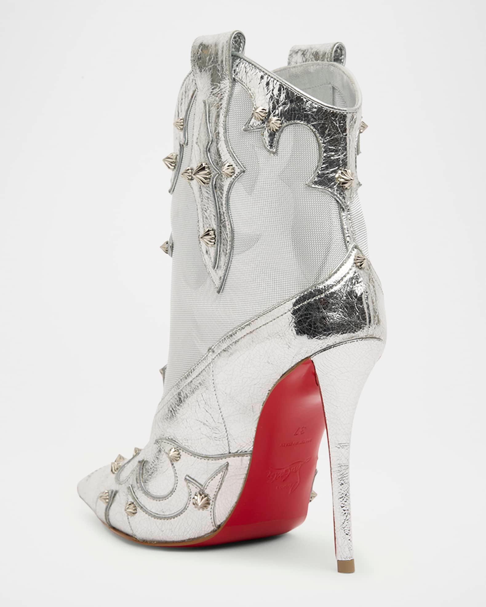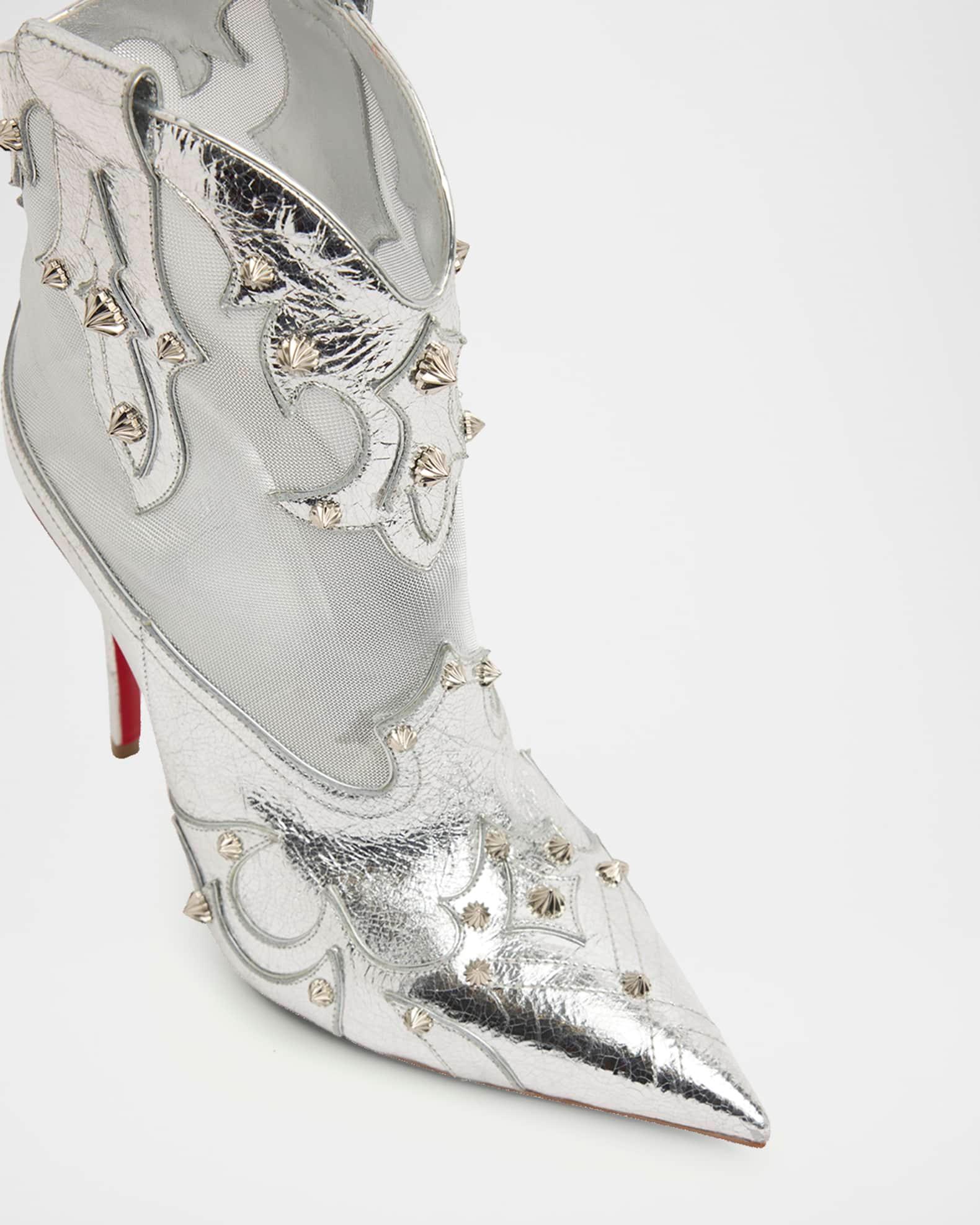 Christian Louboutin western-style booties in metallic leather with signature spike trim 4.00 in / 100 mm stiletto heel Pointed toe Pull-tabs at collar Signature Louboutin red leather outsole Lining: Unlined Made in Italy