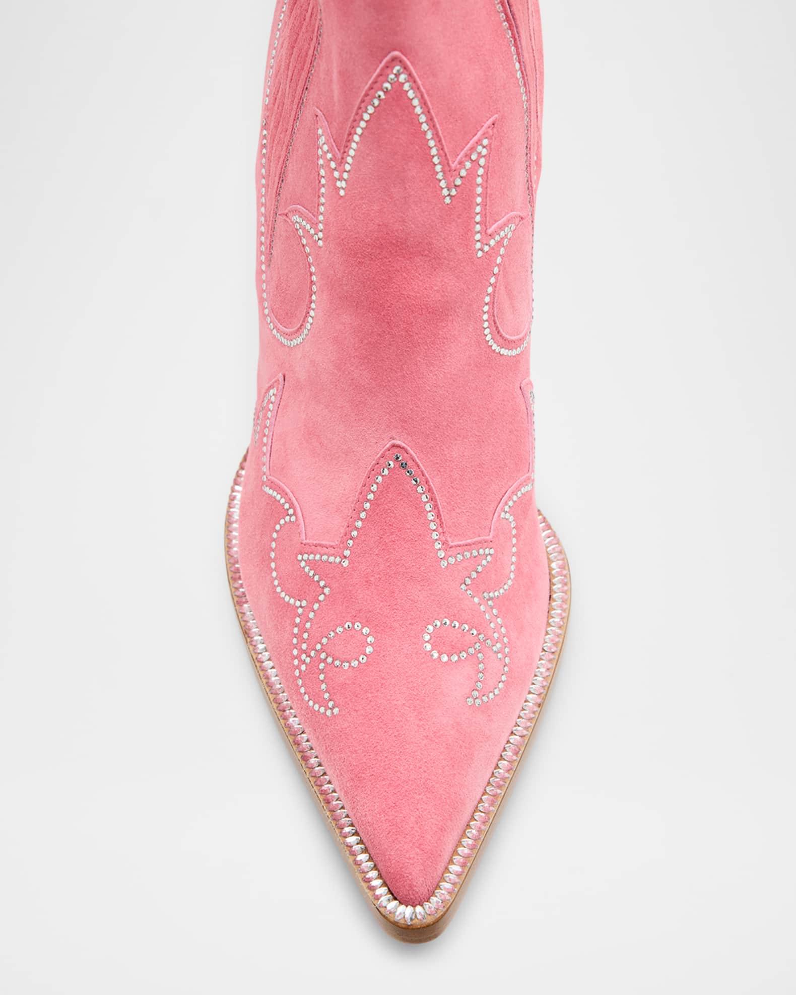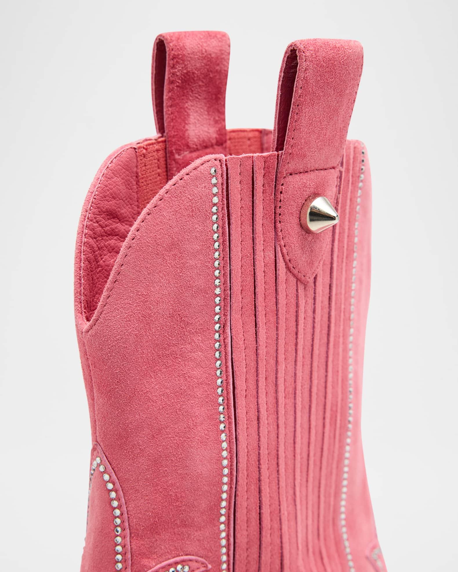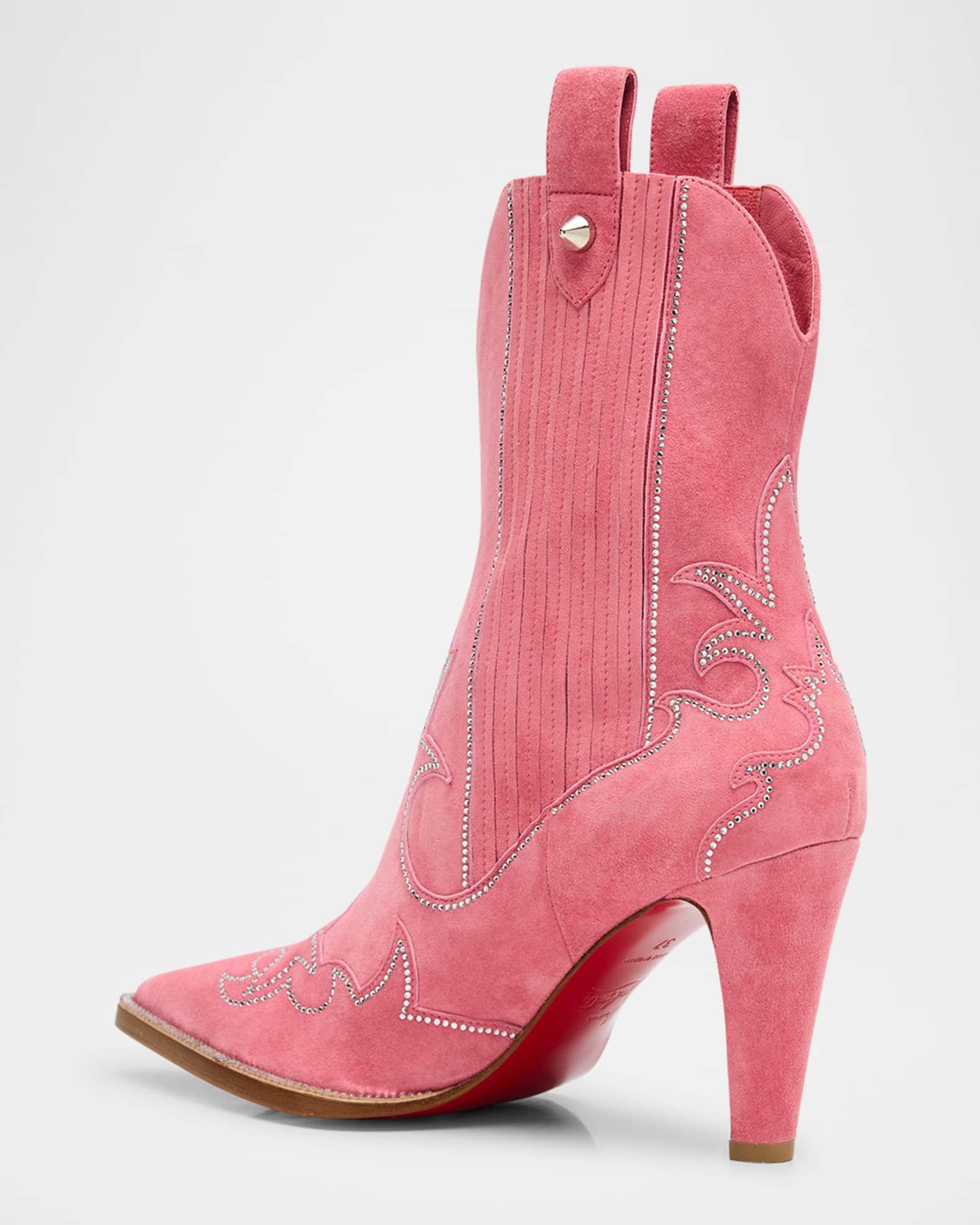 Christian Louboutin "Santigag" western-style ankle boots in suede with rhinestone embellishments 3.25 in / 85 mm covered stiletto heel Pointed toe Curved collar with pull tabs Signature Louboutin red leather outsole Lining: Unlined Made in Italy
