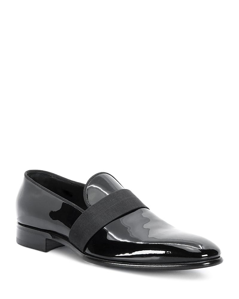 Slip-on patent leather tux shoes defined by a stylish grosgrain strap. Patent leather Narrow toe Slip-on style Stacked heel Leather lining and sole Made in Italy. Mens Shoes - Mens Classic Footwear > Santoni > Saks Fifth Avenue > Barneys. Santoni. Color: Black. Size: 11.