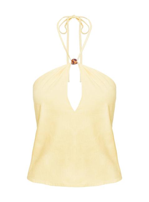 High neck, cut-out front detail, adjustable halter straps, split back with double tie fastening