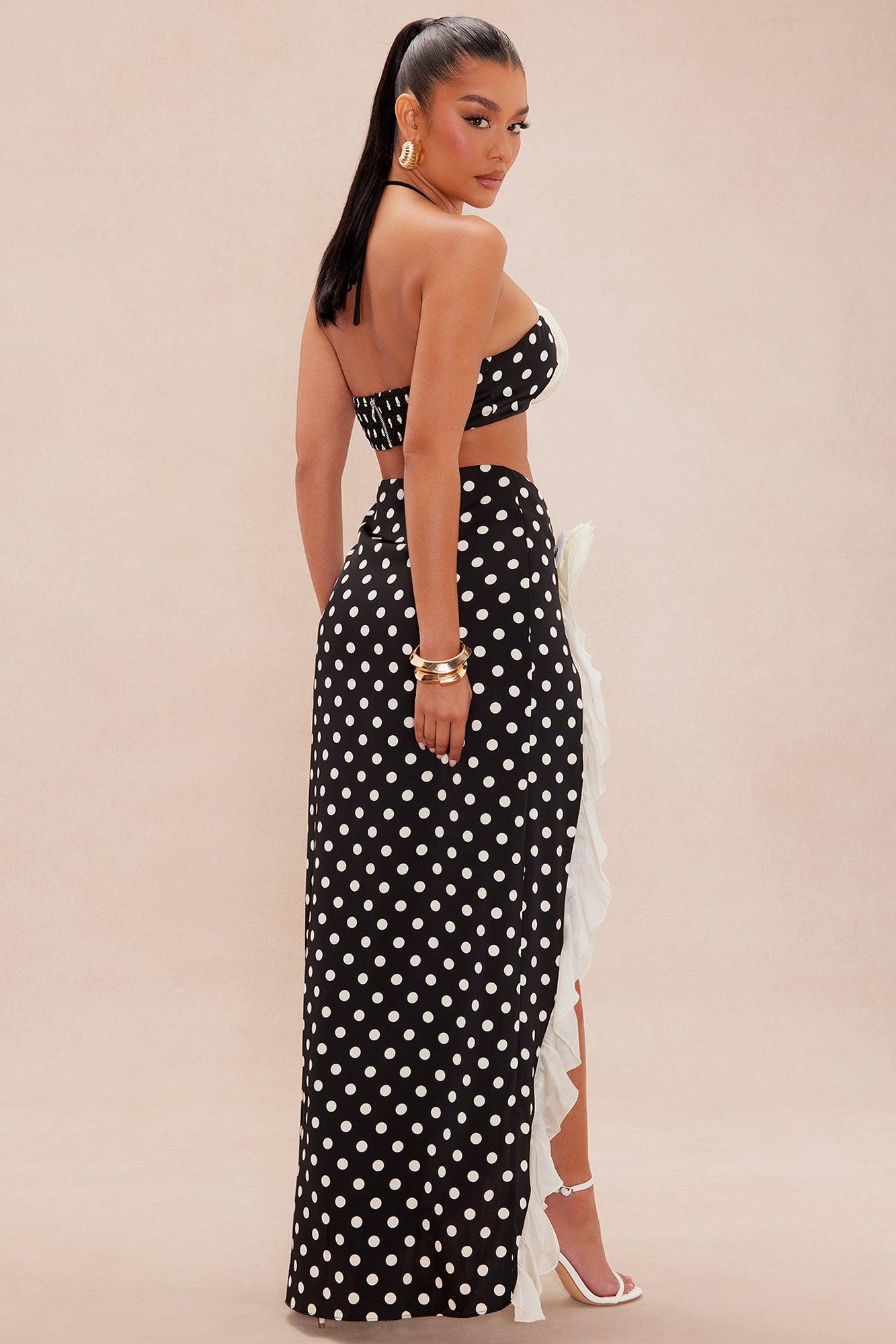 Available In Black/White. Satin Top With Padded Bra Cups Y Neckline Grip Tape Smocked Back Back Zipper Closure Satin Maxi Skirt With Ruffle Trim And Floral Applique Hideen Zipper Closure Polka Dot Print Non Stretch Skirt Length = 44'' Self: 100% Polyester Lining: 100% Rayon Imported