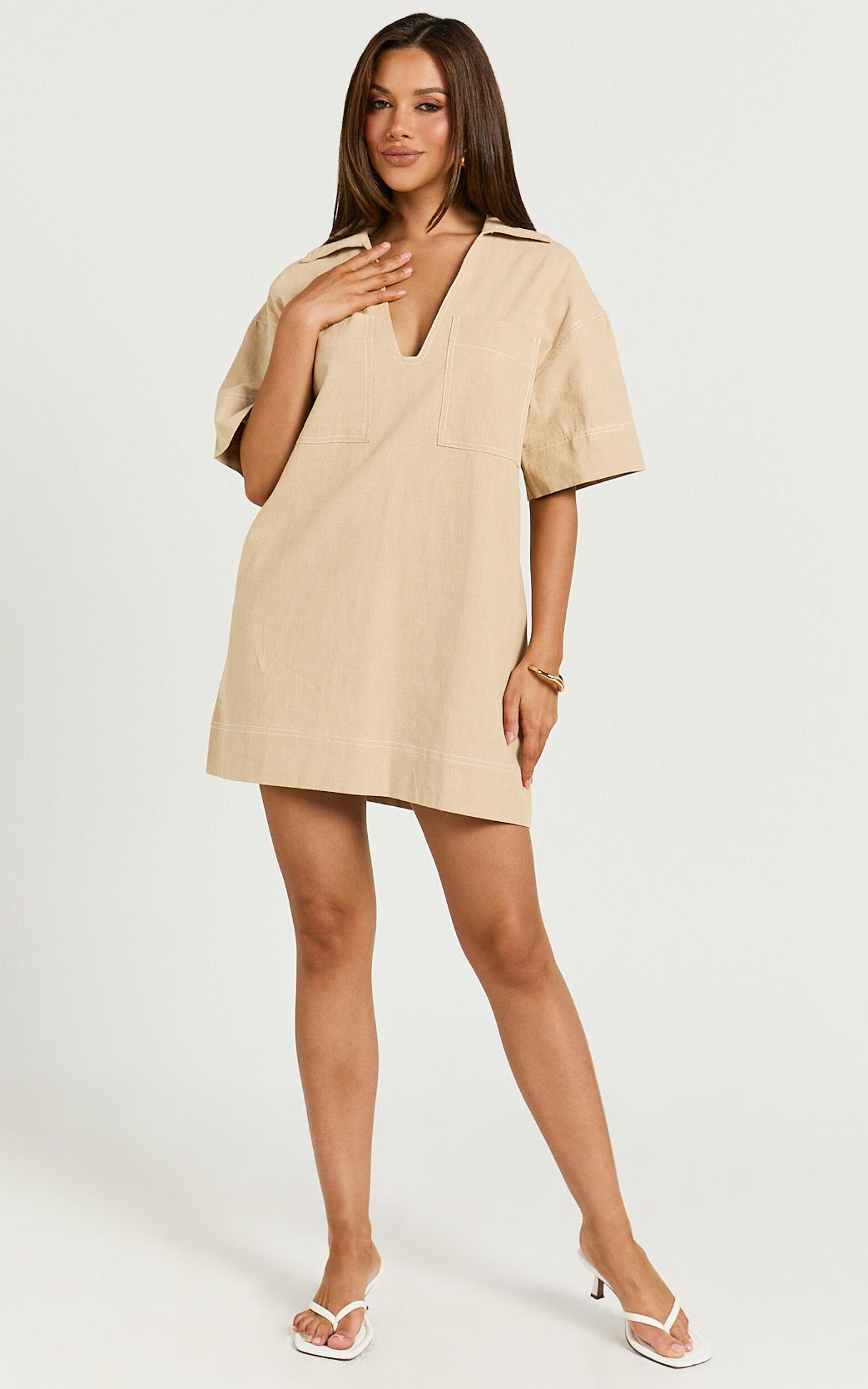 Sanvi Mini Dress - Linen Collared Pocket Shift Dress in Beige