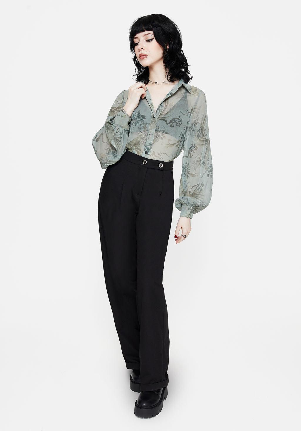 Pale Blue Chiffon Dragon & Moon Print Button Up Shirt Loose Fit For Easy Layering Long Bouffant Sleeves Button Up & Flat Buttoned Cuffs Pointed Collar Sheer Chiffon Fabrication 100% Polyester Kaia is 5'5" and is wearing a size UK6 / US2