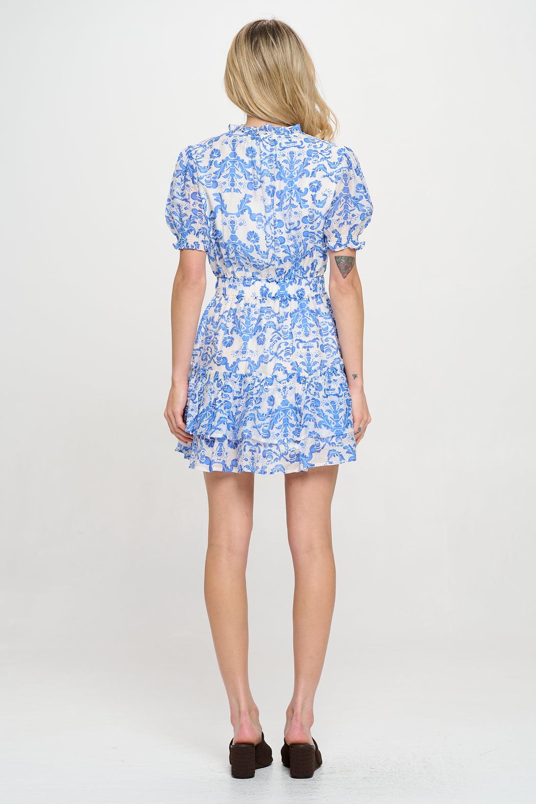 Add a touch of romance to your wardrobe with this puff sleeve mini dress, adorned in an intricate allover baroque floral print. Featuring a flattering surplice neckline, elastic waistband, and tiered ruffle hem, this dress effortlessly blends elegance with playful charm. Lightweight and fully lined, it's ideal for spring soirées, garden parties, or vacation getaways.