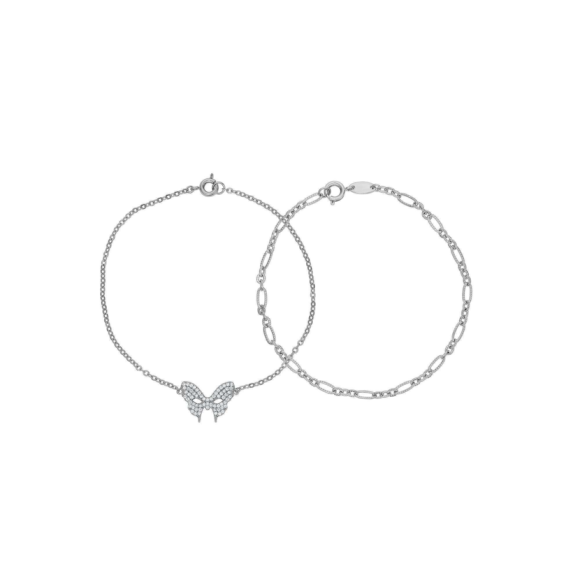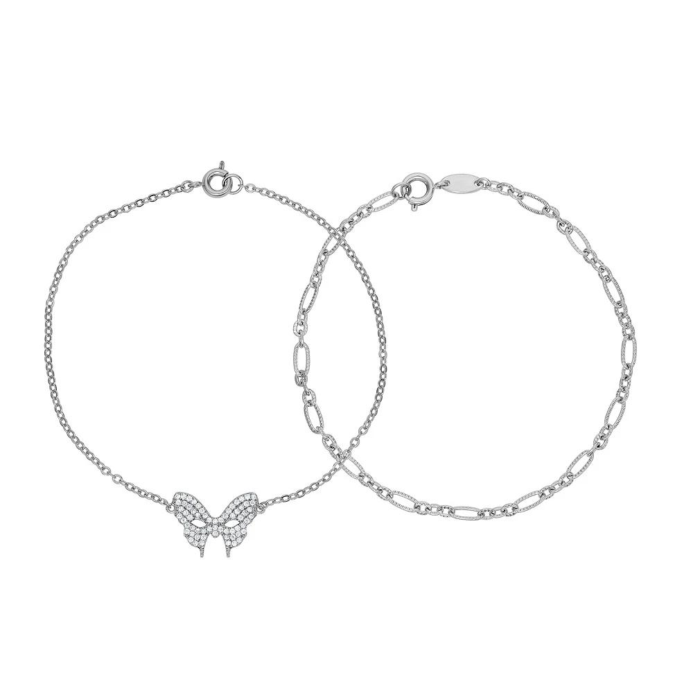 Sarafina delivers charming style with this cubic zirconia butterfly and chain bracelet set. Sarafina delivers charming style with this cubic zirconia butterfly and chain bracelet set. Set includes: 2 bracelets Length: 7.5 in. Packaging: boxed Metal: bronze Plating: rhodium, sterling silver Finish: polished Nickel freeSTONE DETAILS Stone type: cubic zirconia Center stone size: 1 mm Total weight: 1/2 ct. Color: clear Setting: prong Size: 7.5. Color: White. Gender: female. Age Group: adult. Material: Silver Plate.