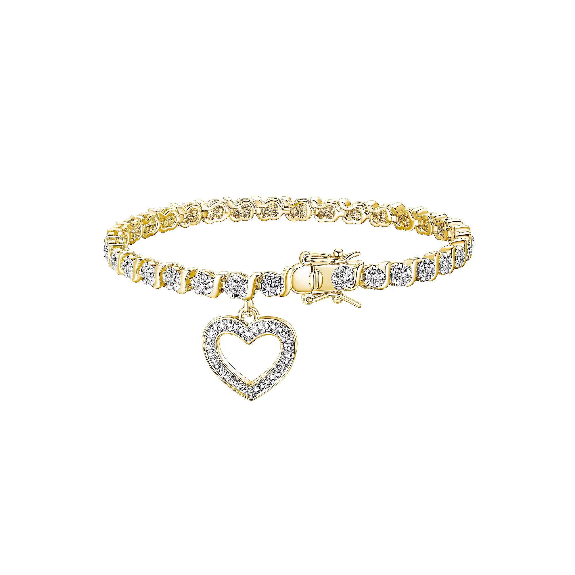 Charm your friends with this lovely diamond accent heart charm bracelet by Sarafina. Charm your friends with this lovely diamond accent heart charm bracelet by Sarafina. Nickel free Metal: brass Charm size: 9/16L x 9/16W Length: 7.25 in. Packaging: boxed Plating: 14k gold flash, silver tone Finish: polishedDIAMOND DETAILS Total weight: less than 1/10 ct. Color grade: I-J Clarity: I5 Shape: round Setting: pave Diamond weights are approximate. Diamond Total Weights may vary between .01 and .13 ct. Some diamonds consist of fewer than 17 facets. Gemstones may have been treated to enhance their appearance. Special care may be required. Please visit our Gemstone Treatment & Special Care Guide for more information. Image(s) may be enlarged to show detail. Please note, due to the high value of this item, a signature may be required upon delivery. Size: 7.25. Color: White. Gender: female. Age Group: adult.