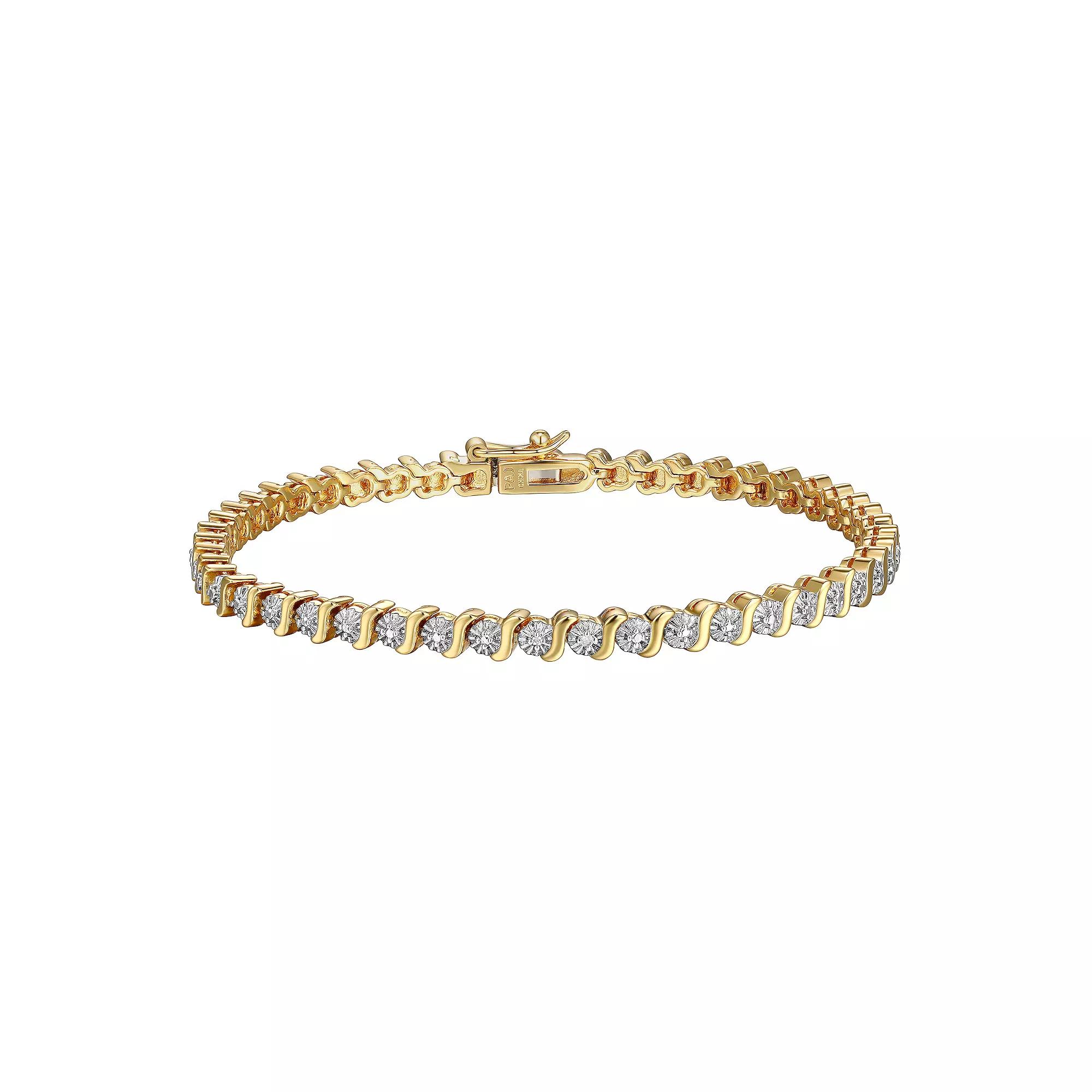 Make your outfit shine with this Sarafina diamond accent S-link tennis bracelet. Make your outfit shine with this Sarafina diamond accent S-link tennis bracelet. Nickel free Metal: brass Length: 7.25 in. Packaging: boxed Plating: 14k gold flash plated, silver tone Finish: polishedDIAMOND DETAILS Total weight: less than 1/10 ct. Color grade: I-J Clarity: I5 Shape: round Setting: pave Diamond weights are approximate. Diamond Total Weights may vary between .01 and .13 ct. Some diamonds consist of fewer than 17 facets. Gemstones may have been treated to enhance their appearance. Special care may be required. Please visit our Gemstone Treatment & Special Care Guide for more information. Image(s) may be enlarged to show detail. Please note, due to the high value of this item, a signature may be required upon delivery. Size: 7.25". Color: White. Gender: female. Age Group: adult.