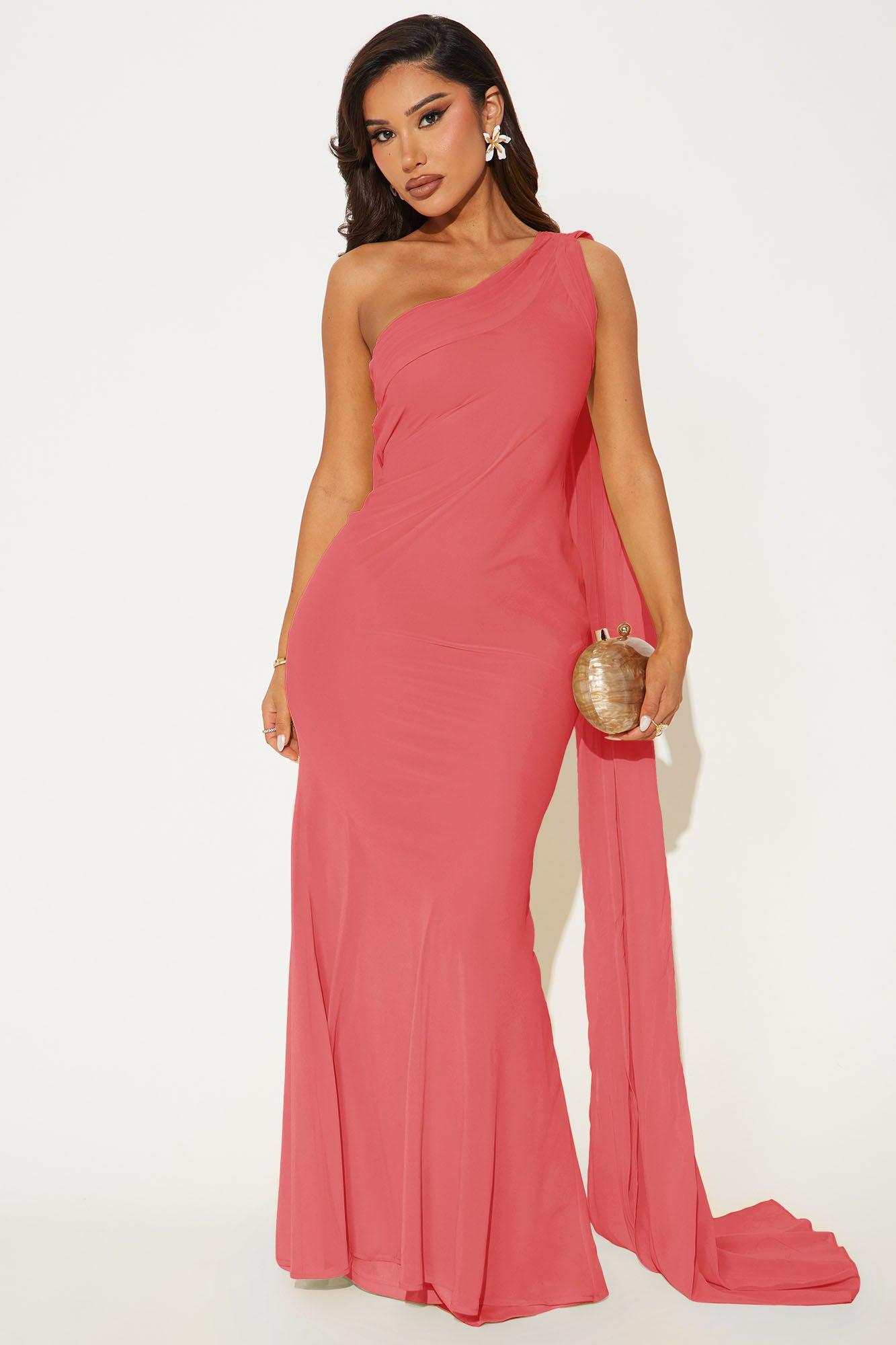 Available In Blue, Butter Yellow, Coral And Plum. Chiffon Maxi Dress One Shoulder Drape Detail Hidden Back Zipper Lined Slight Stretch Self/Lining: 100% Polyester Imported