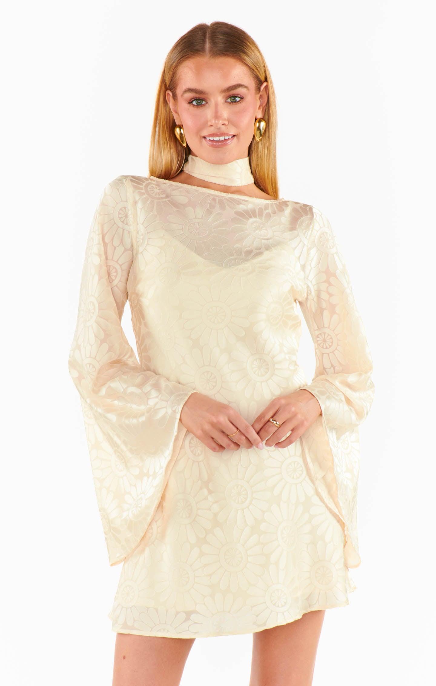 Flirty and fun in our Sarah Mini Dress! This cream, long-sleeved mini provides an effortlessly chic look with a fun daisy pattern. Perfect for all your bridal events styled with matching accessories and gold jewelry.