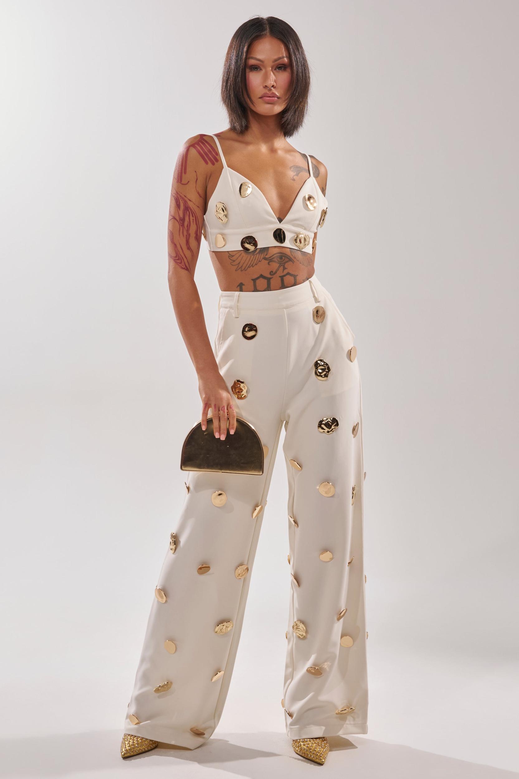 Serve disco diva! The AKIRA Label Sarasota Embellished Bralette features a sleek, structured silhouette with a deep V-neckline and thin adjustable straps, accented by oversized gold-tone disc embellishments that add bold, modern glam. Designed with a comfortable smocked elastic back panel with hooks for a flexible, secure fit, the top combines clean minimalism with statement hardware for a luxe, eye-catching finish. Pair with the AKIRA Label Sarasota Embellished Trouser for a complete set and an eye-catching look. - Main Fabric: 92% Polyester 8% Spandex, Lining: 98% Polyester 2% Spandex- Spot Clean Only- Slight Stretch- Imported (all measurements are approximate from size small)- 8” Shoulder to Hem- 17” Strap (adjustable)- Model is 5’7” and wearing size smallProduct ID: 1070539 (all measurements are approximate from size 1X)- 10” Shoulder to Hem- 19” Strap (adjustable)Product ID: 1070543