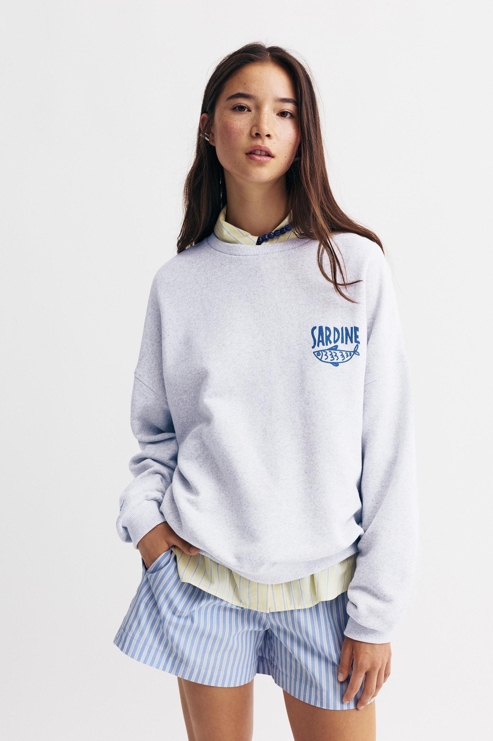 Grey round neck sweatshirt with sardine graphic, text, and long sleeves. Pacific Republic Collection